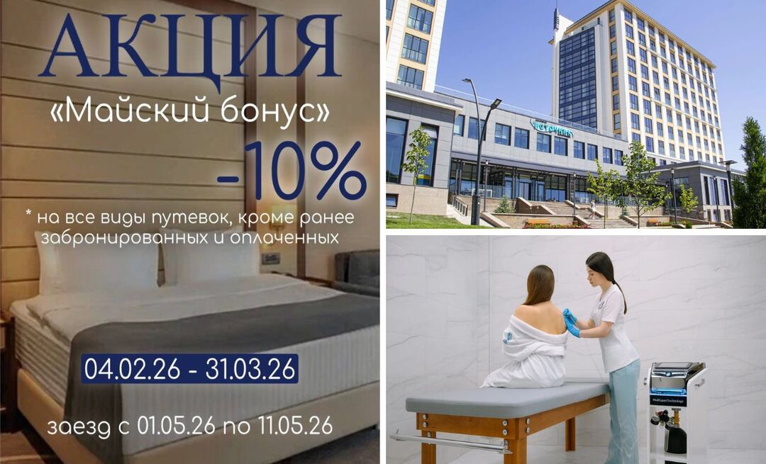 Акция распространяется на все оздоровительные программы санатория. Забронировать путевку на специальных условиях можно до 31 марта 2026 года включительно. Сам отдых должен прийтись на период с 1 по 11 мая 2026 года.