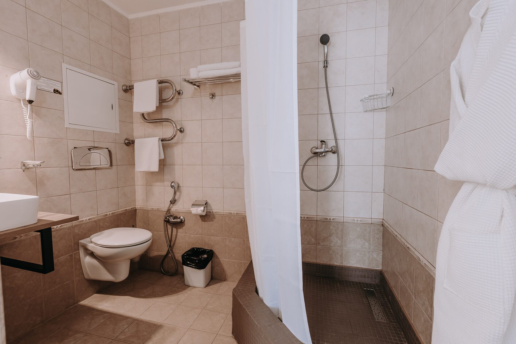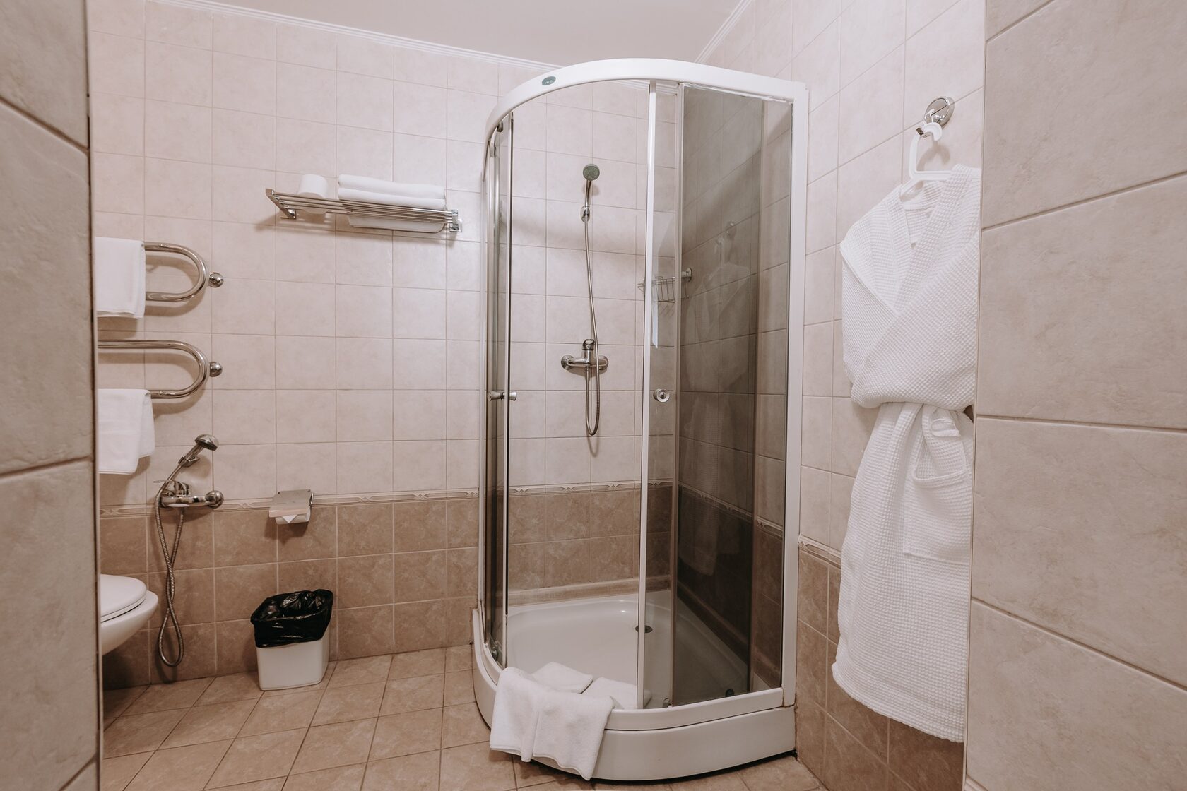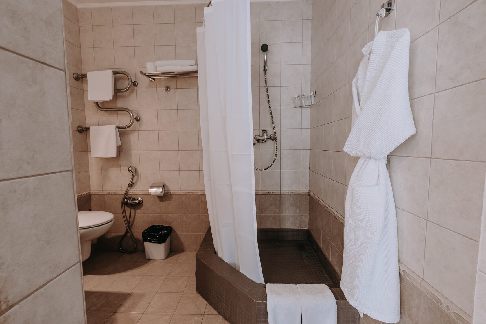 Санузел: с душевой кабиной, тапочки, туалетные принадлежности, фен, халат.