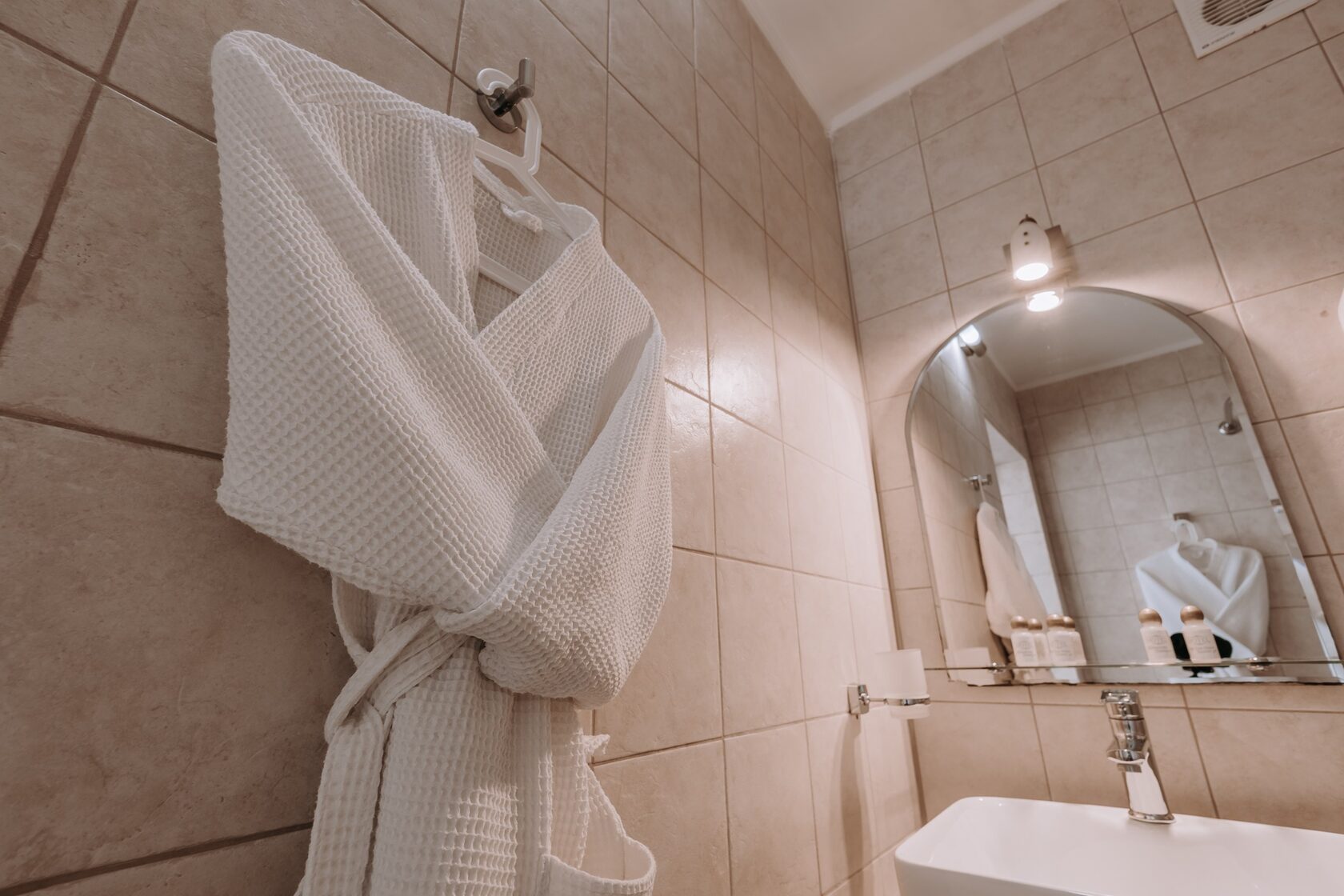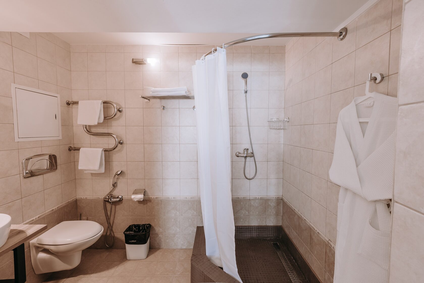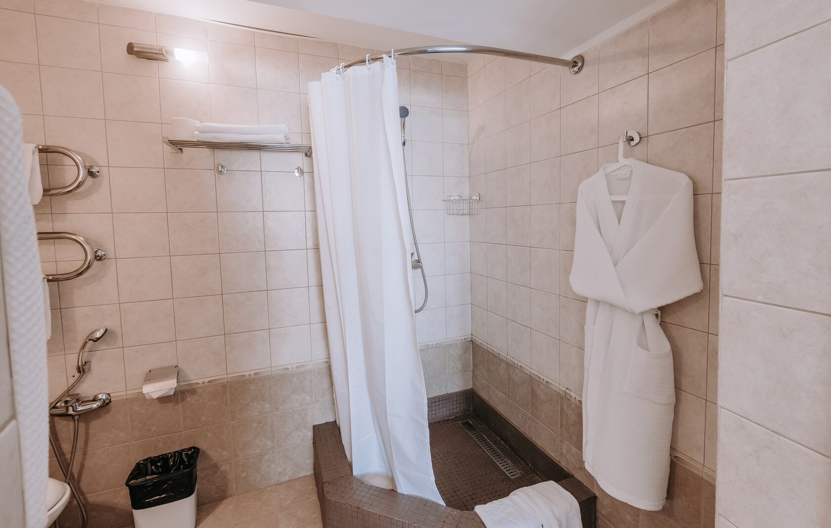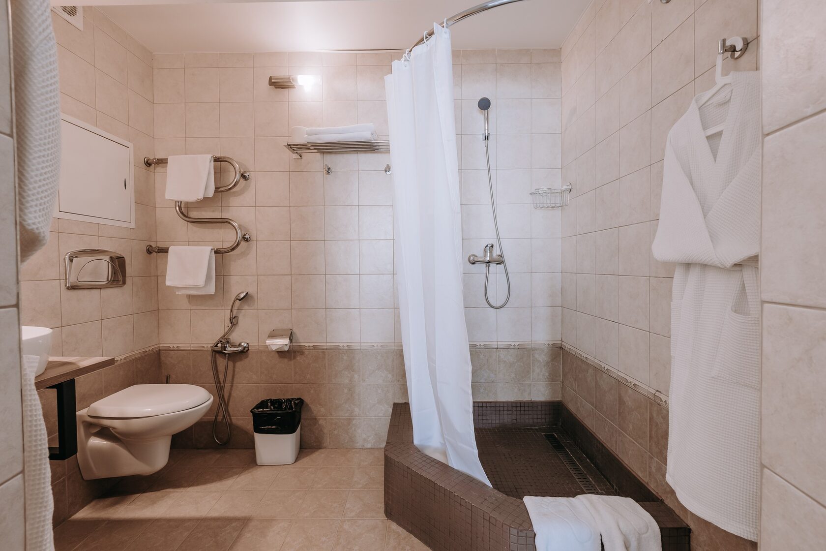 Санузел: с душевой кабиной, тапочки, туалетные принадлежности, фен, халат.
