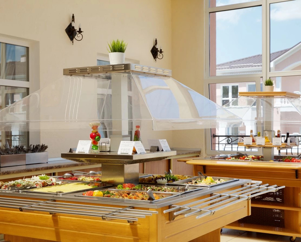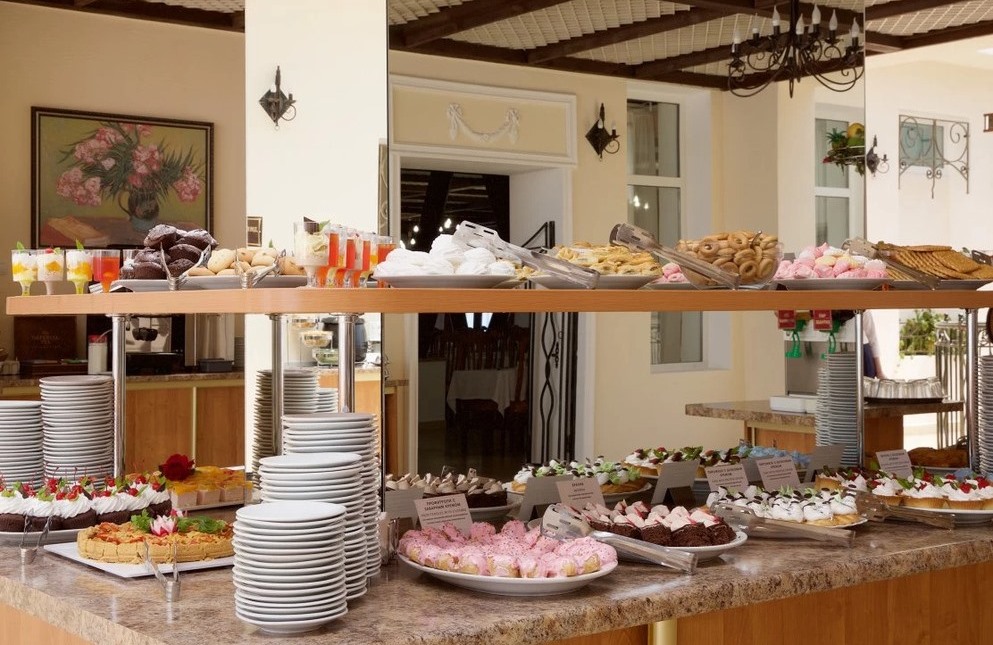 Питание по системе «шведский стол» организовано в основном ресторане. Отдельно предусмотрена diet-линия с низкокалорийным питанием и детская шведская линия. Для самых маленьких есть стульчики для кормления, микроволновая печь, подогреватель для бутылочек, блендеры и детское питание.