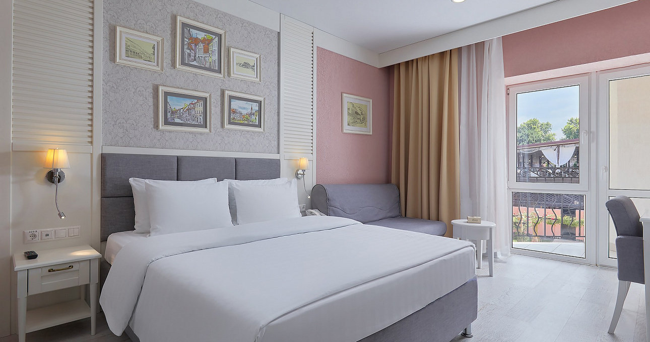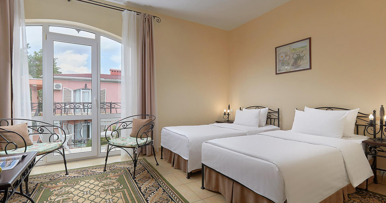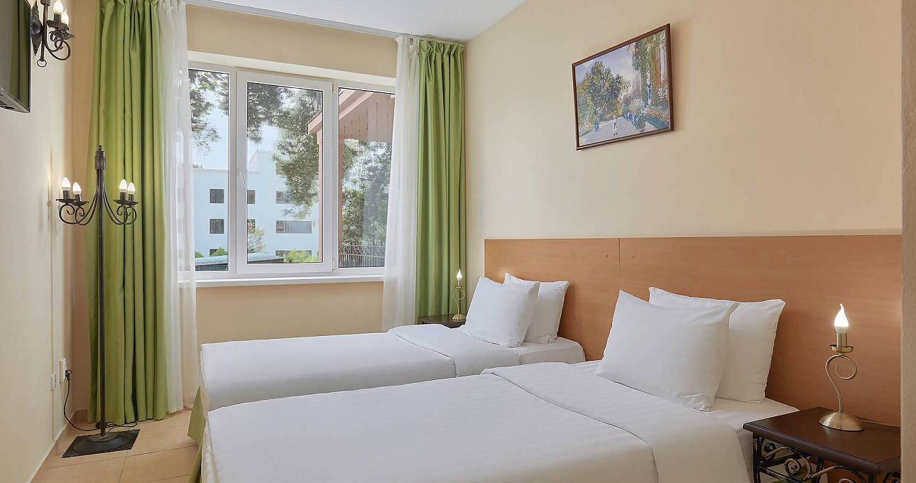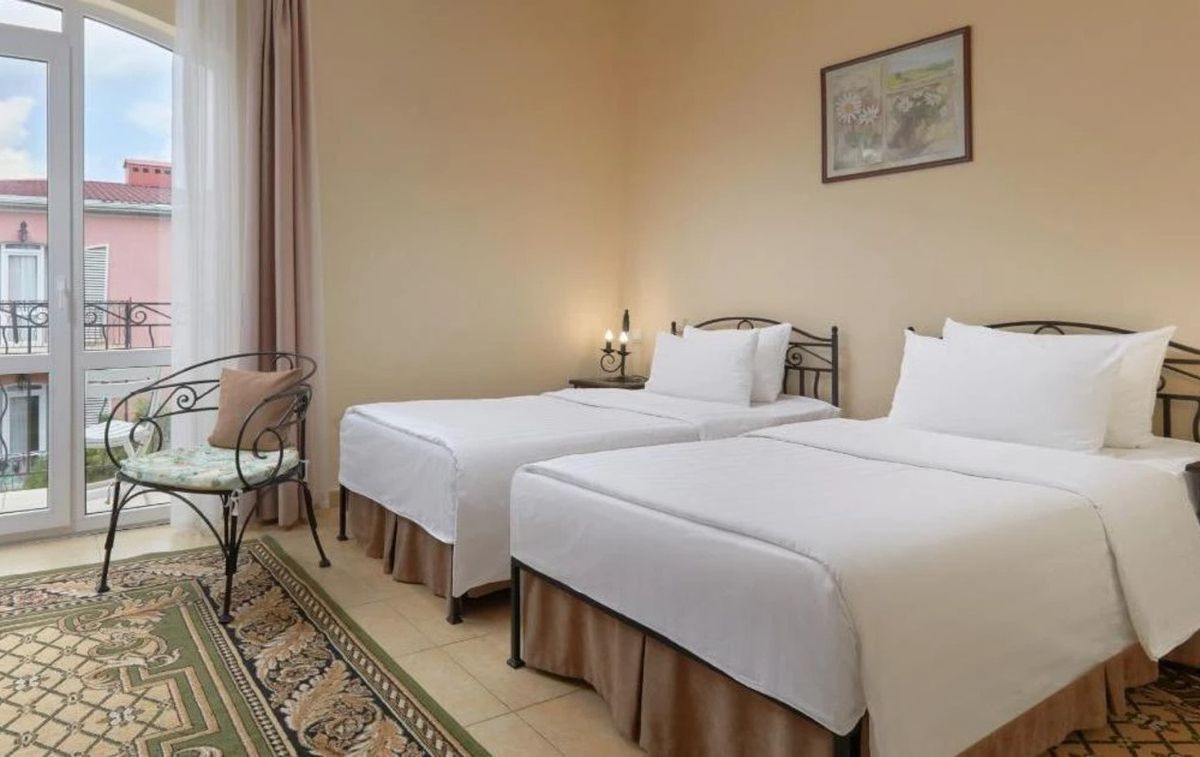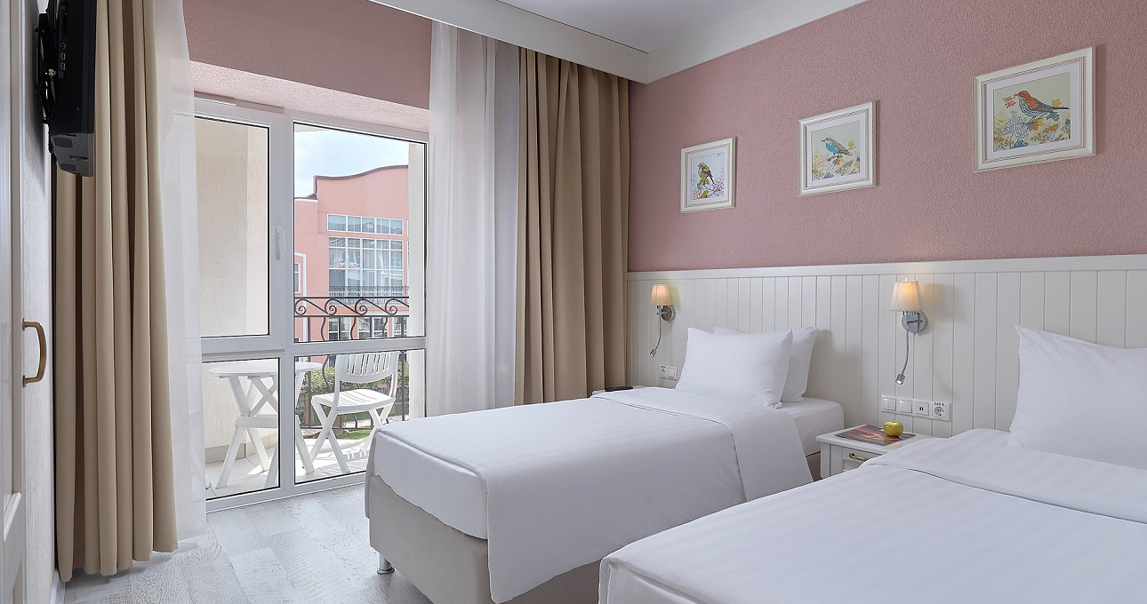 Сервис: Уборка номера ежедневно, смена постельного белья раз в 3 дня, питьевая бутилированная вода, брендированные подарки детям.