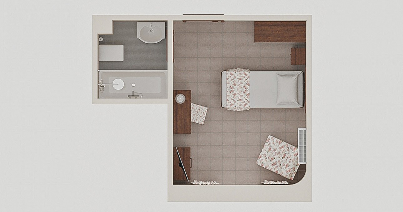 Мебель: Односпальная кровать, тумба, шкаф, туалетный столик, пуфик.