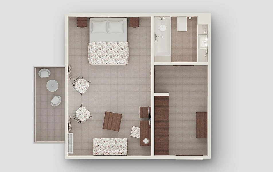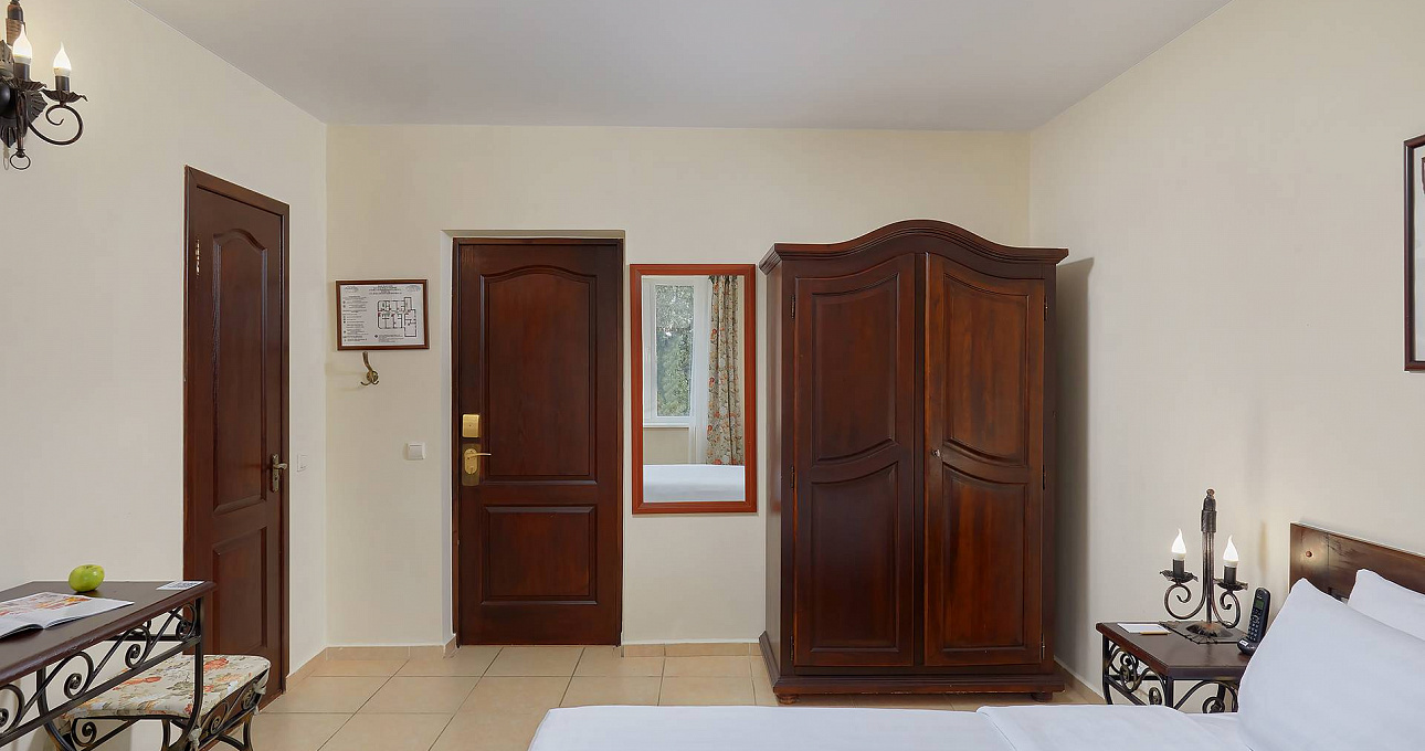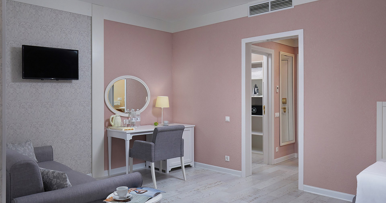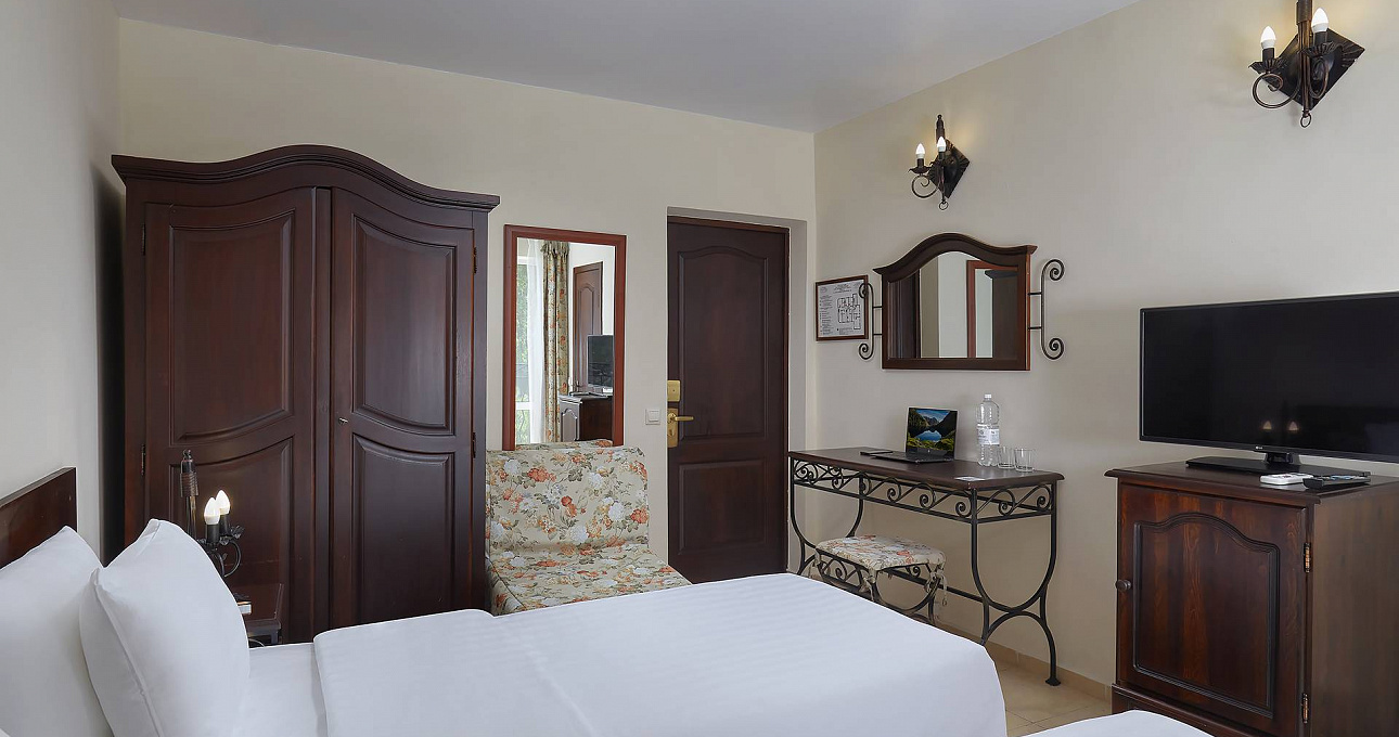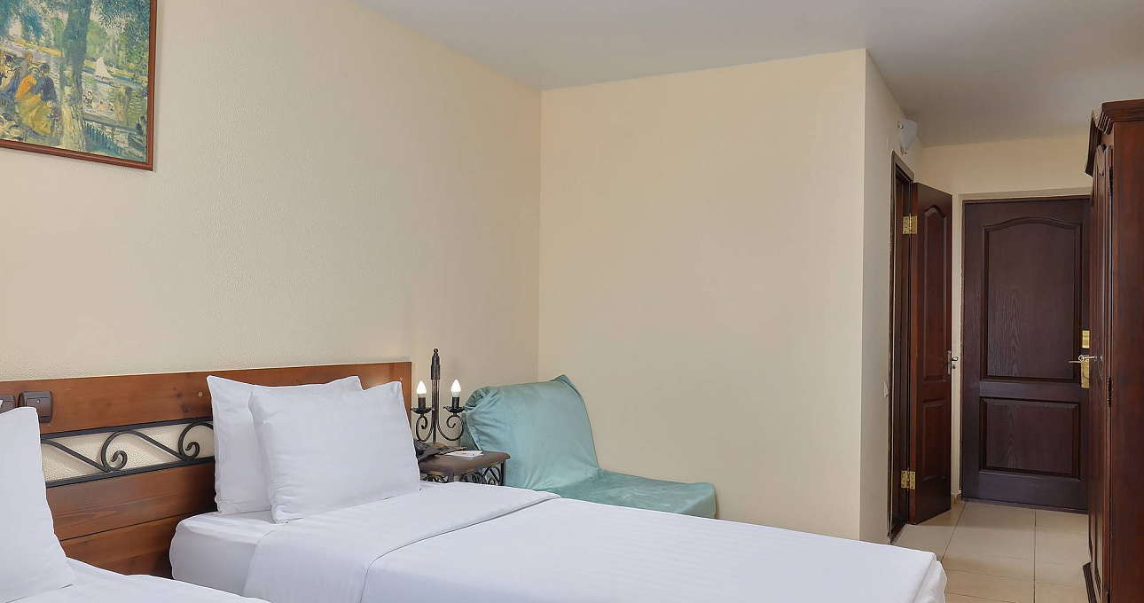 Мебель: Две односпальные/двуспальная кровать, шкаф, туалетный столик, пуфик, два кресла, багажная полка, журнальный столик.