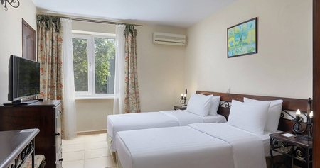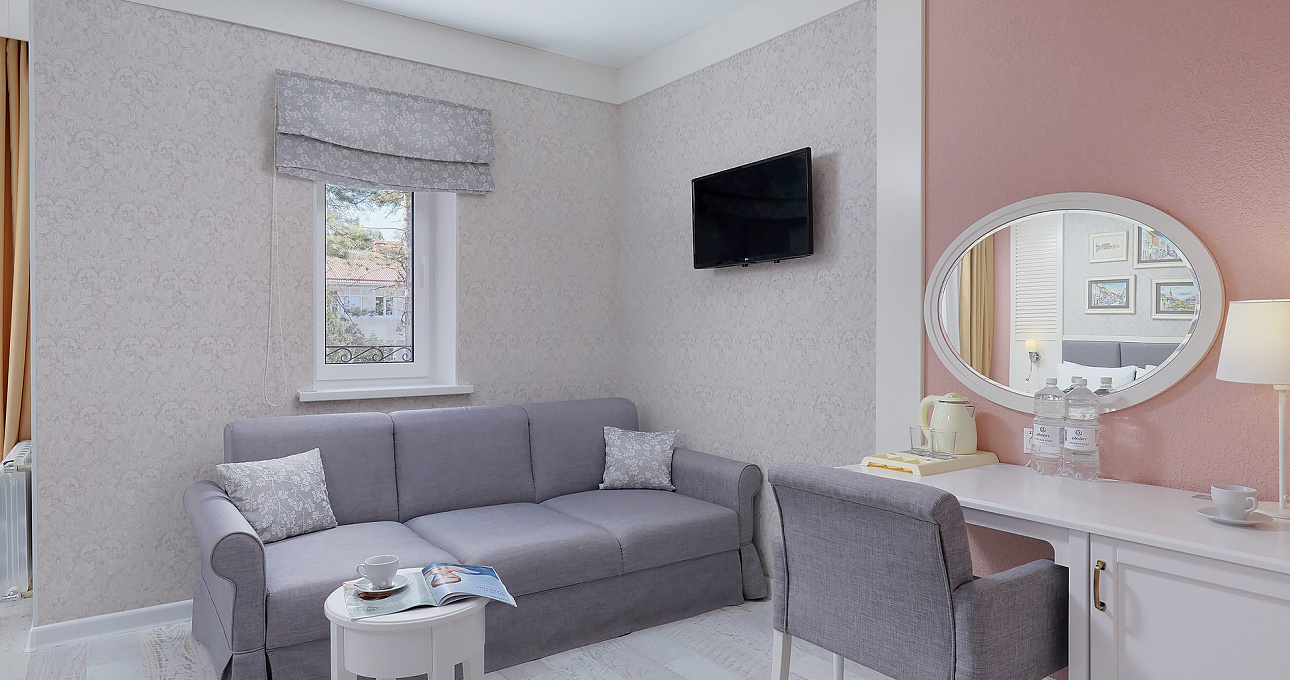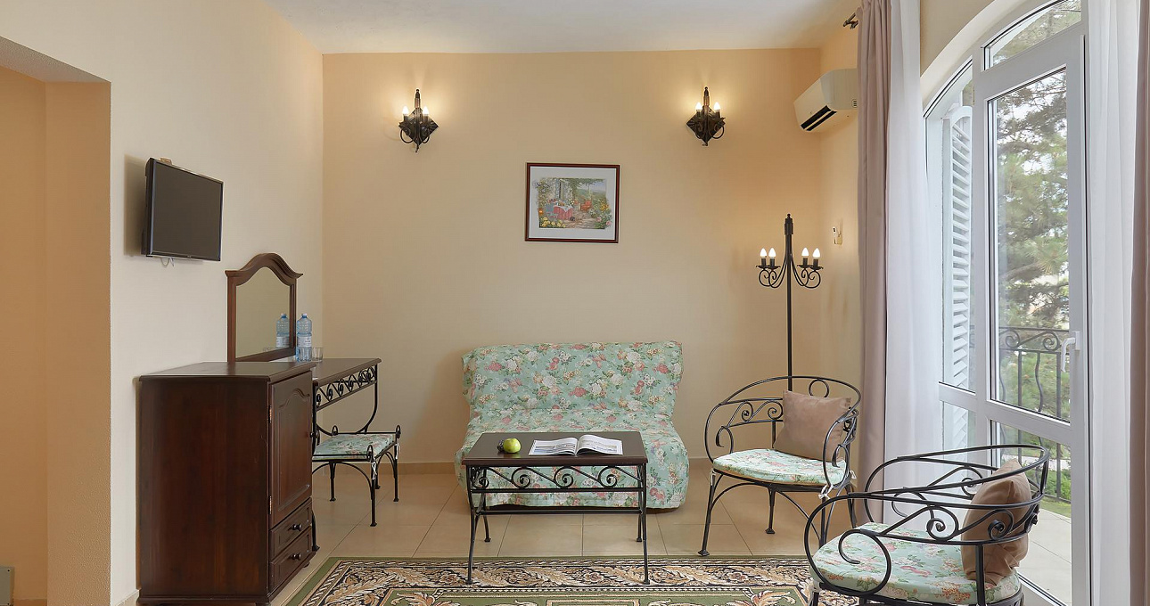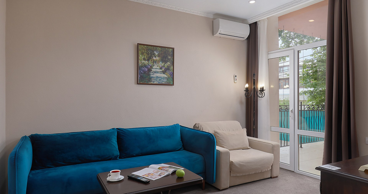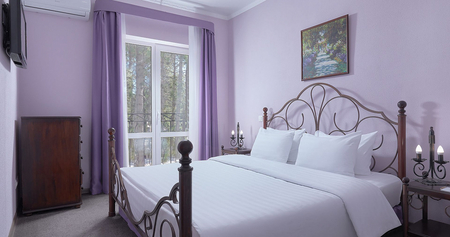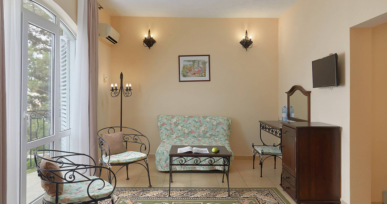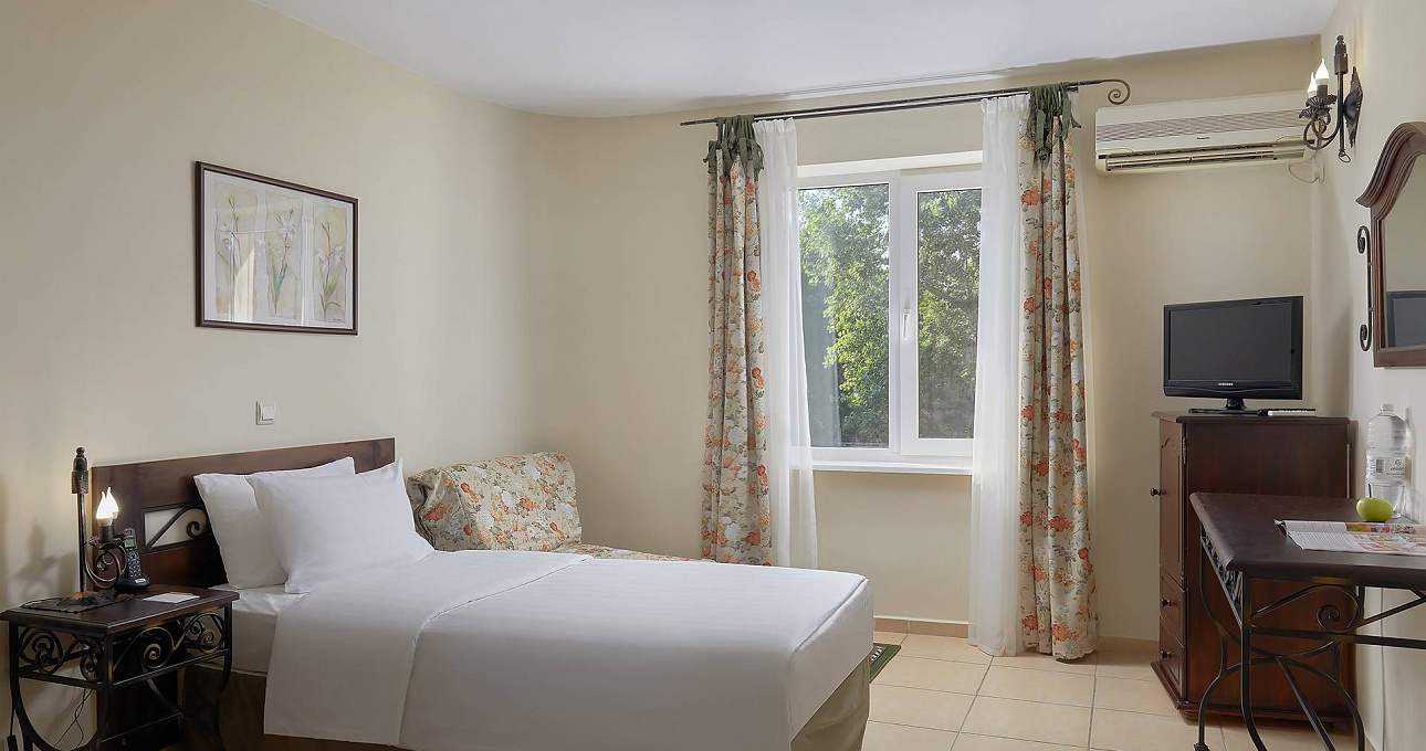 Оборудование: Мини-холодильник, сплит-система, телевизор, сейф, чайная станция, гладильная доска и утюг, телефон, Wi-Fi.