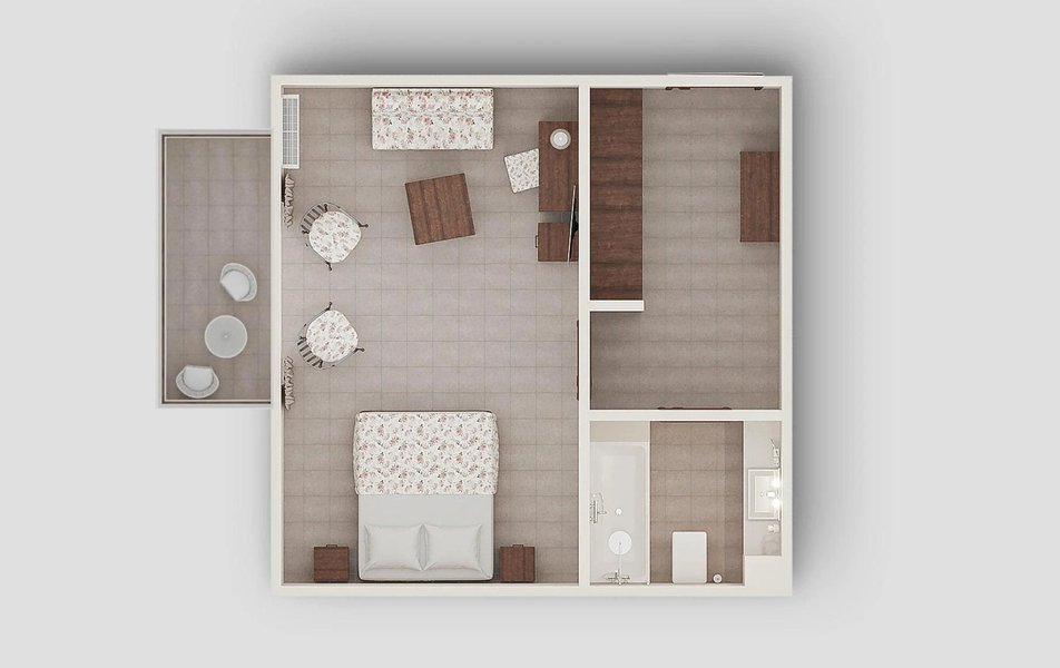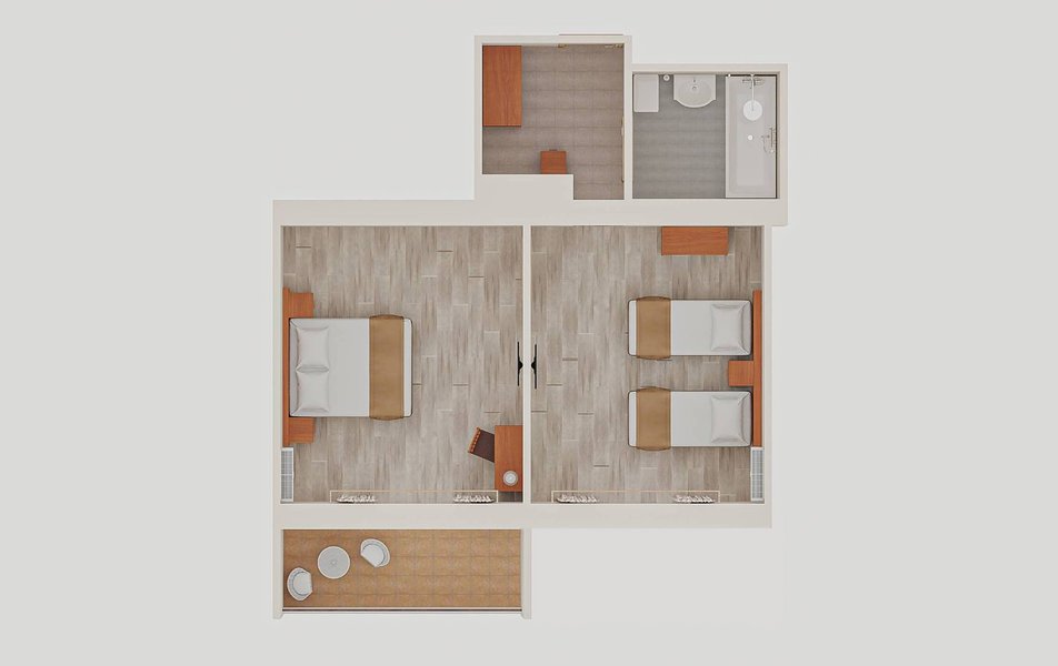 Мебель: Две односпальные/двуспальная кровать, шкаф, туалетный столик, пуфик, багажная полка, журнальный столик.