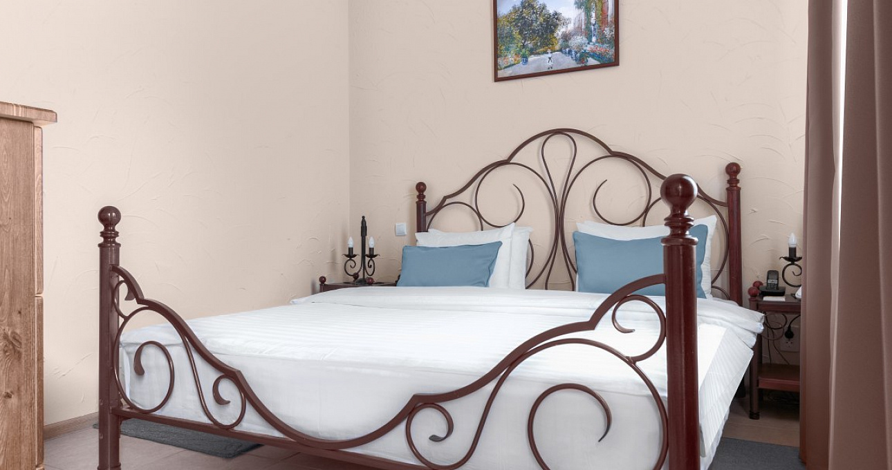 Мебель: Две односпальные/двуспальная кровать, тумба, шкаф, туалетный столик, пуфик.