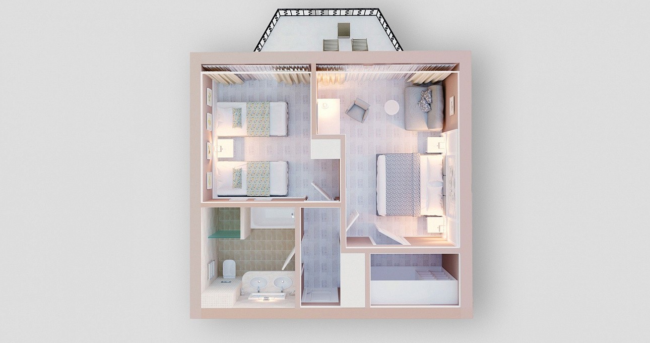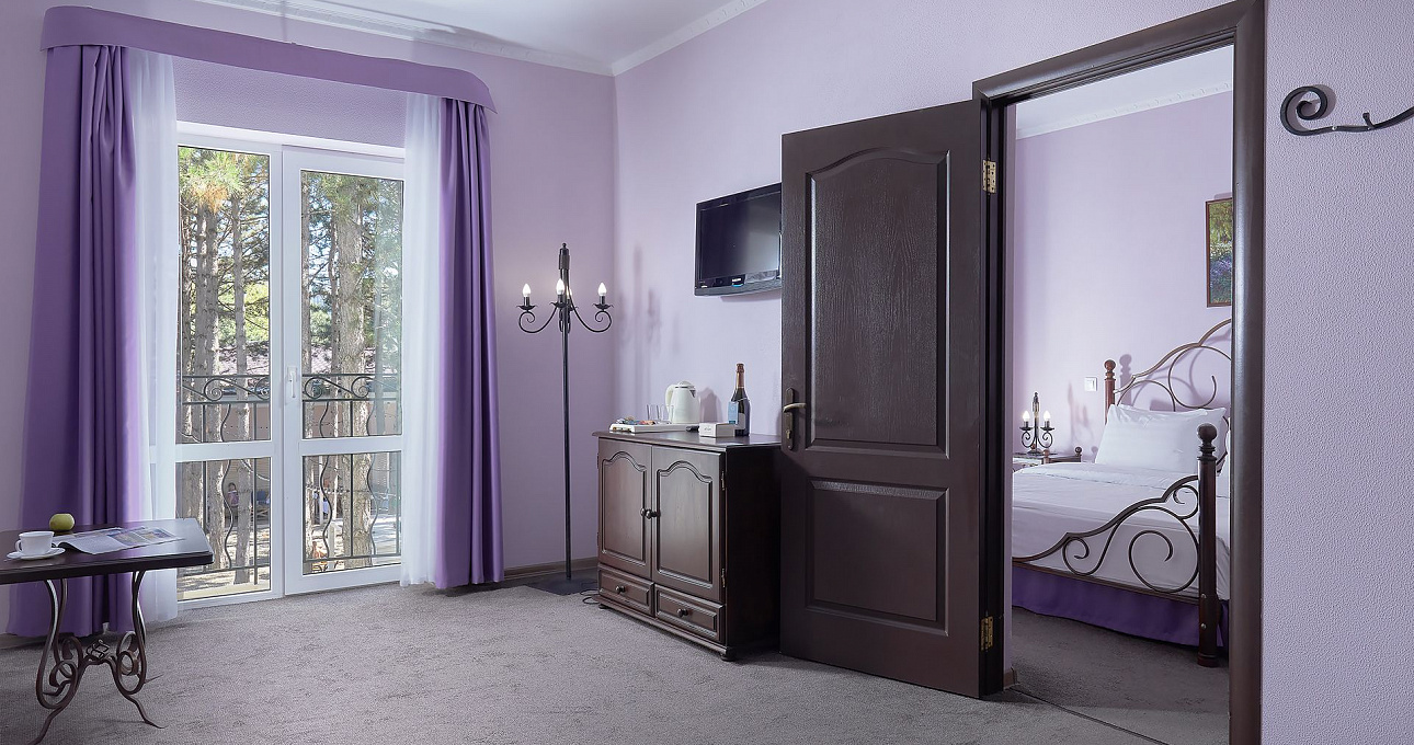 Мебель: Две односпальные кровати, двуспальная кровать, стол-тумба, шкаф, туалетный столик, багажная полка, прикроватные тумбы, журнальный столик, зеркало.