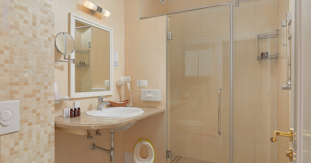 Санузел: Душевая кабина, фен, детская подставка для ног, детское сиденье на унитаз, косметическое зеркало, косметический набор.