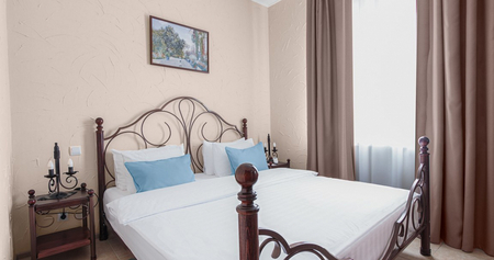 Мебель: Двуспальная кровать, две односпальные кровати, прикроватные тумбы, шкаф, туалетный столик, зеркало, журнальный столик.