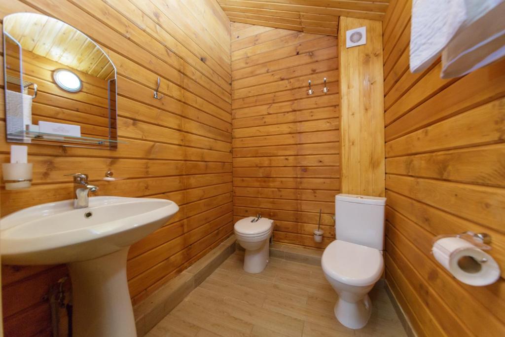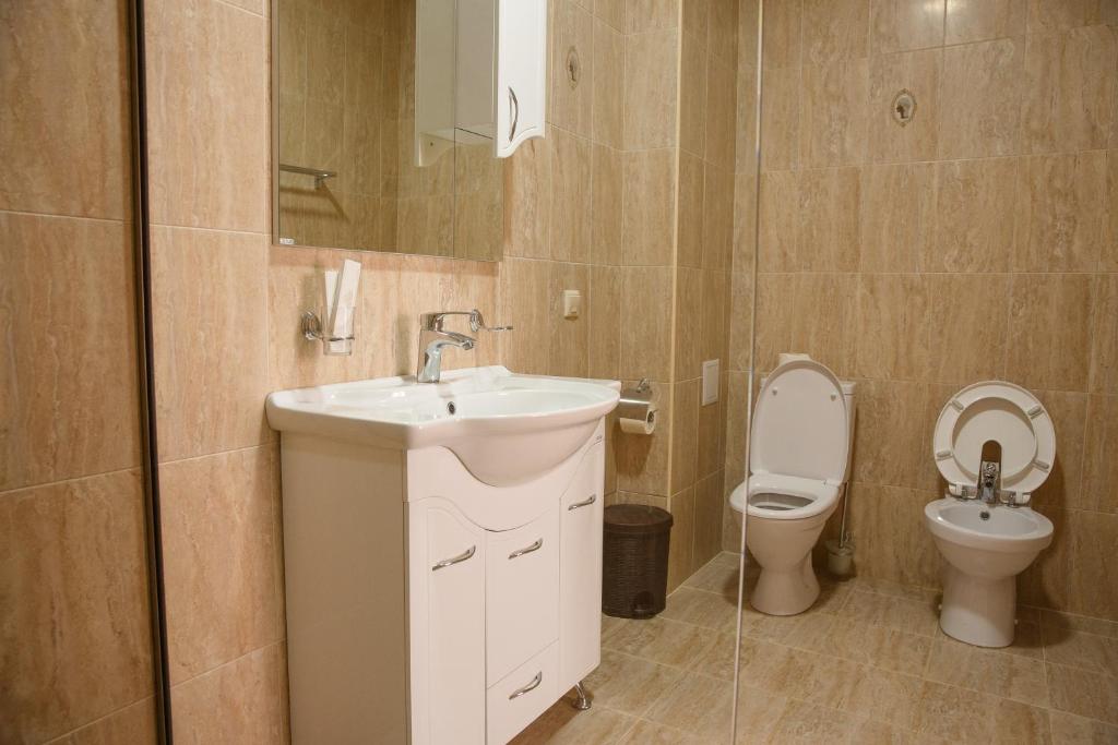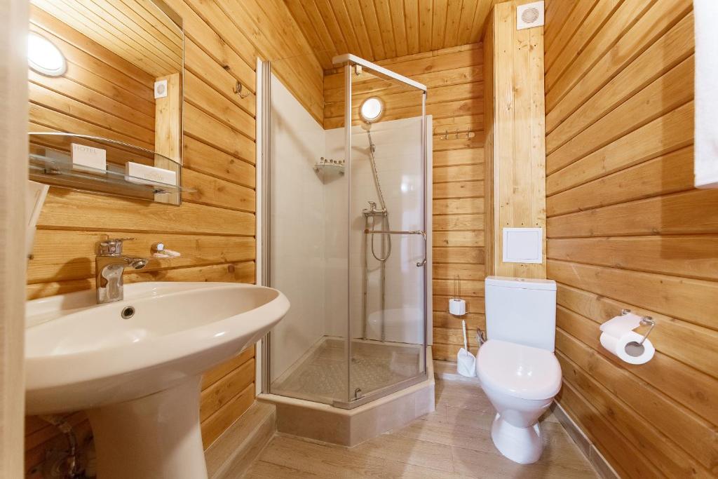Санузел: с душевой кабиной, тапочки, туалетные принадлежности, фен, халат.