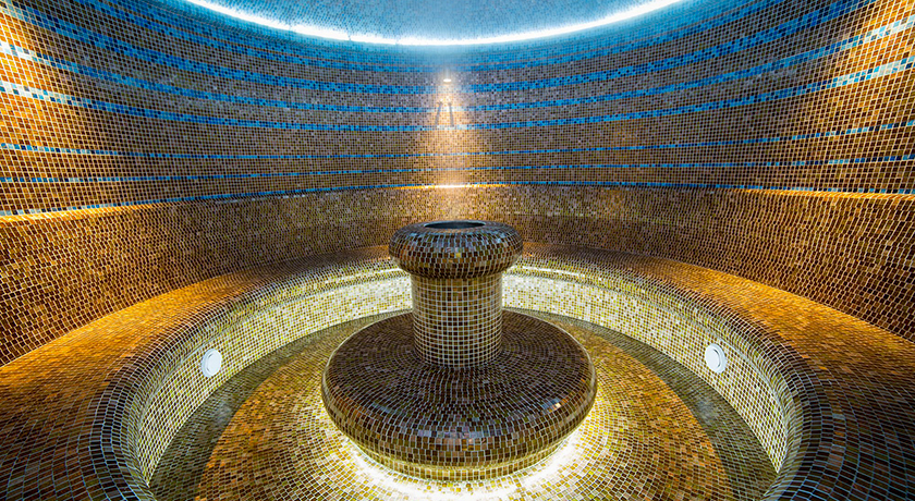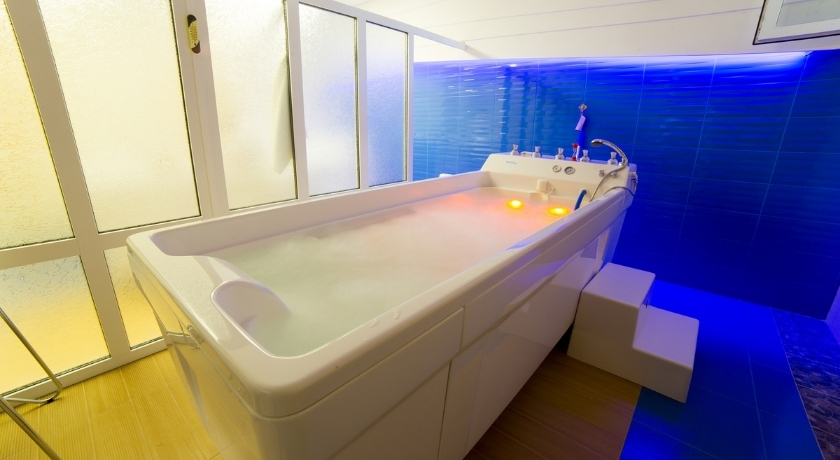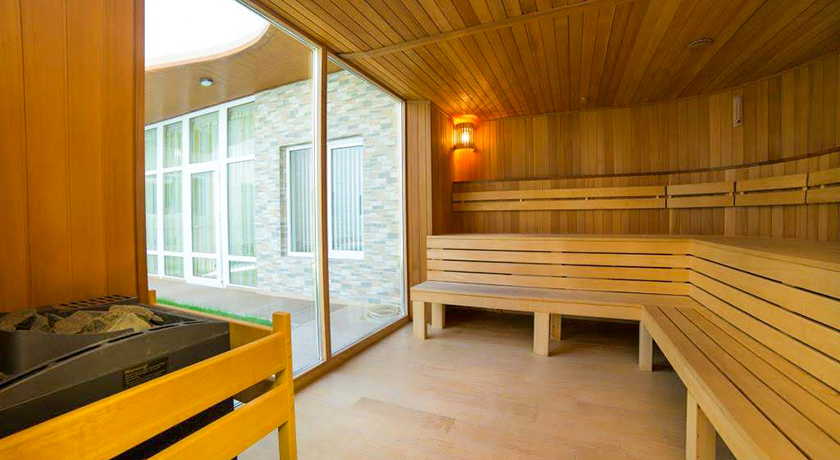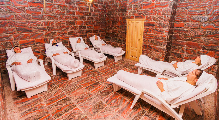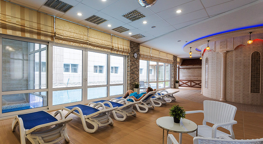 Комплекс состоит из соединенных переходами пяти корпусов разной этажности: от трех до шести. Это и спальные здания, и медицинский корпус, и ночной клуб, и сооружение с крытым всепогодным бассейном с морской водой. Есть на территории здравницы и морской бассейн под открытым небом – с горкой, фонтаном и водопадом, для взрослых и детей.