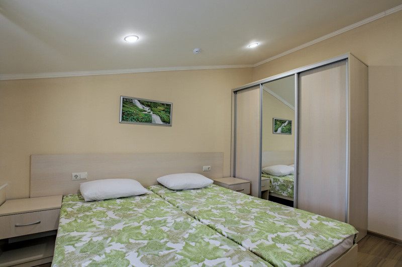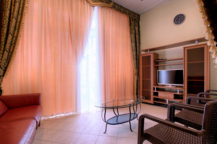 Отличный санаторий! Идеален для семейного отдыха, особенно с детьми. Кондиционер, в номере стандарт на двоих, расположен так, что не дует на спящих, так как есть разделение на зоны. Есть холодильник, два телевизора, фен, утюг и доска, посуда и приборы, тазик для стирки. Халат, тапочки, расчёска, губка, гели для душа и шампунь. Но нет бальзамов и лосьонов. Такие мелочи, как ватные диски и палочки тоже порадовали. В шкафу по шесть плечиков на гостя. Сейф. Четыре белоснежных полотенца и пятое для пляжа. Пляж охраняемый. Оборудован душевыми, раздевалками, лежаками и креслами. Есть качели, огражденная зона для малышей. Навесы от солнца, камеры хранения и вода в кулере с одноразовыми стаканчиками. Чисто. Питание в ресторане, на мой взгляд, разнообразное и привычное для россиян. Вкусно и полезно! Отдохнула и подлечилась! Расписание процедур составлено так, чтобы не было наслоений, распечатку дают на руки. Не советую, лишь, покупать путёвки на экскурсии, что предлагает «Виват», у входа в ресторан. Обман! Но это уже не о санатории...