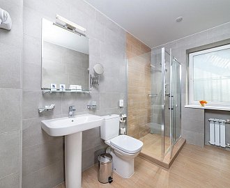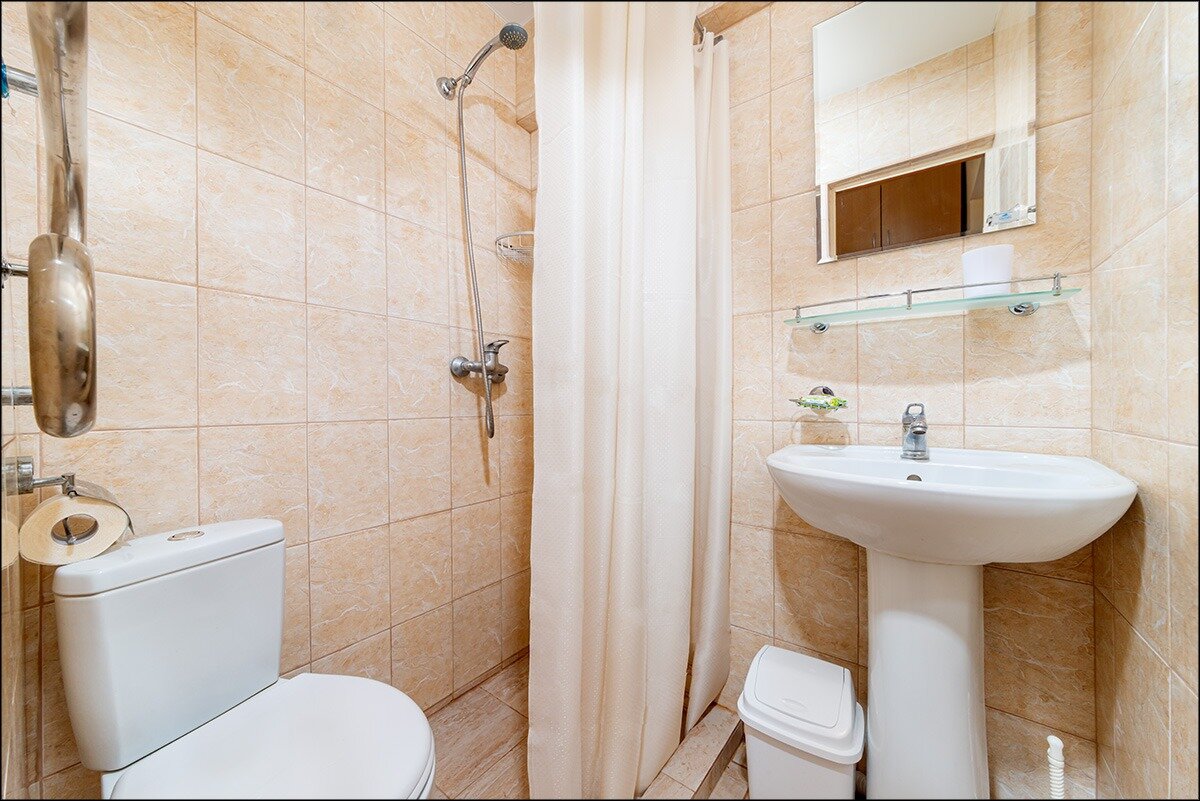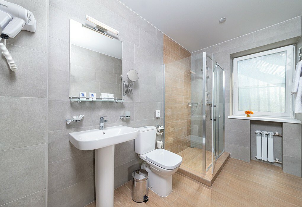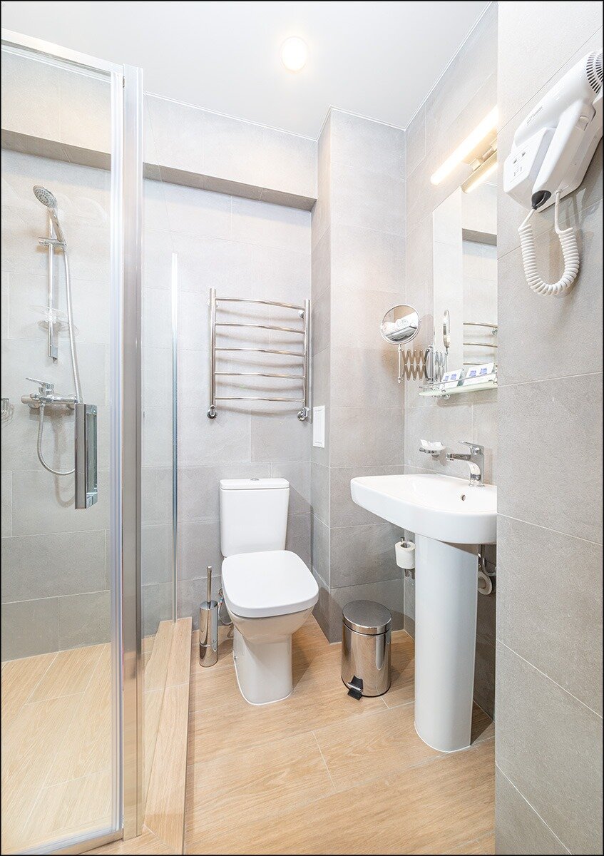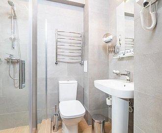 Санузел: Душевая кабина, раковина, унитаз, фен, банные полотенца, гигиенические средства.