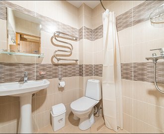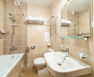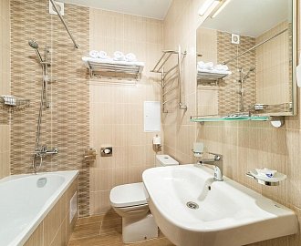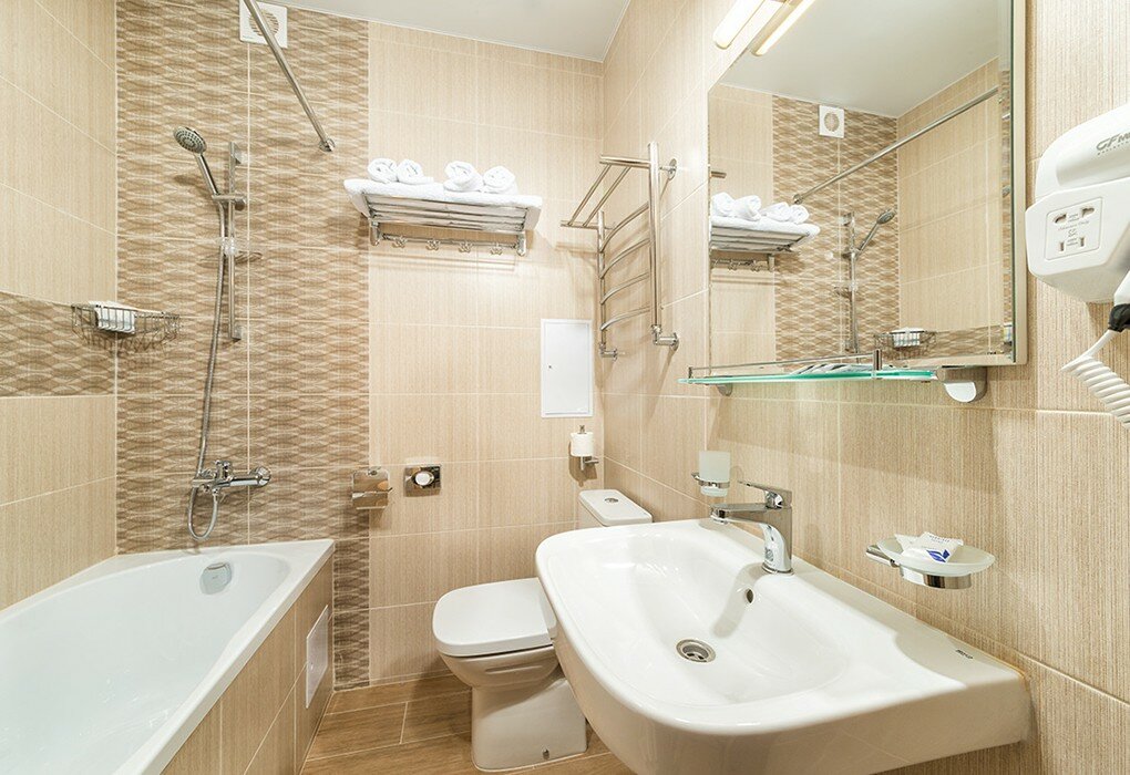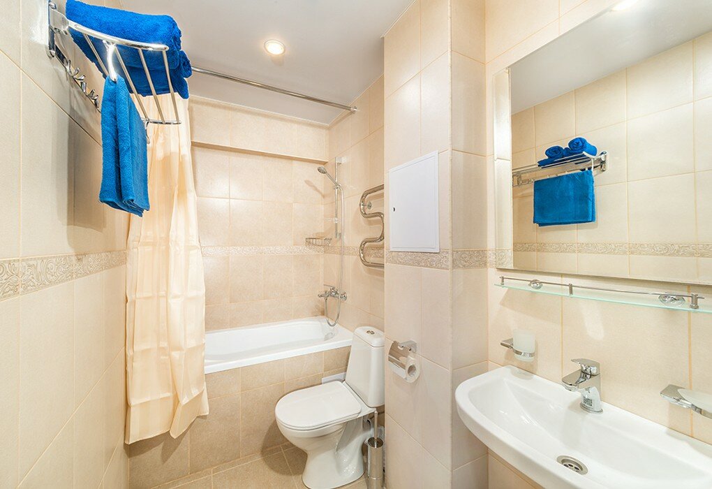 Санузел: Ванна или душевая кабина, раковина, унитаз, банные полотенца.
