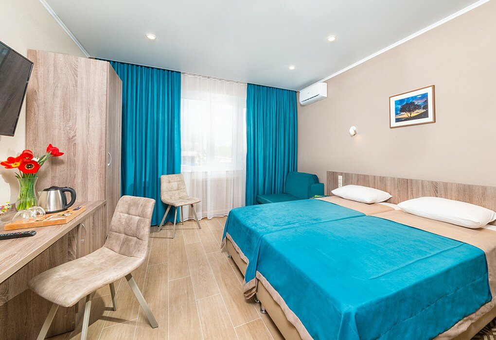 Мебель: Две односпальные кровати, шкаф для одежды, тумбочки, стол, стулья, багажная тумба, вешалки, зеркало.
