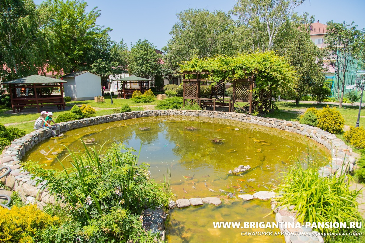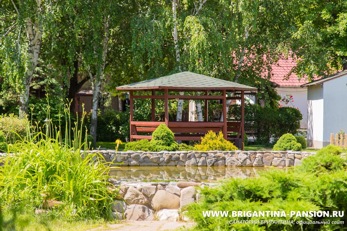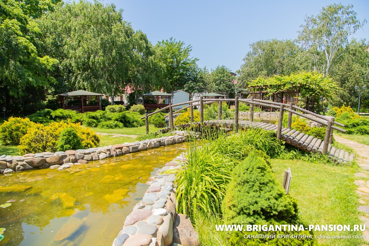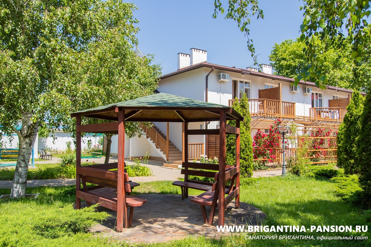 Территория «Бригантины» окружена высоким забором по периметру. За комплексом ведется круглосуточное наблюдение. Местность дополнена зелеными насаждениями, клумбами, беседками, лавочками и даже небольшим прудом с рыбами. На территории санатория находится: