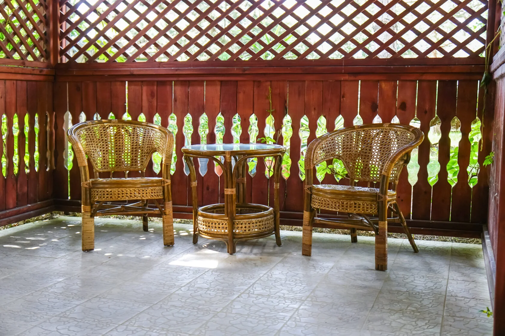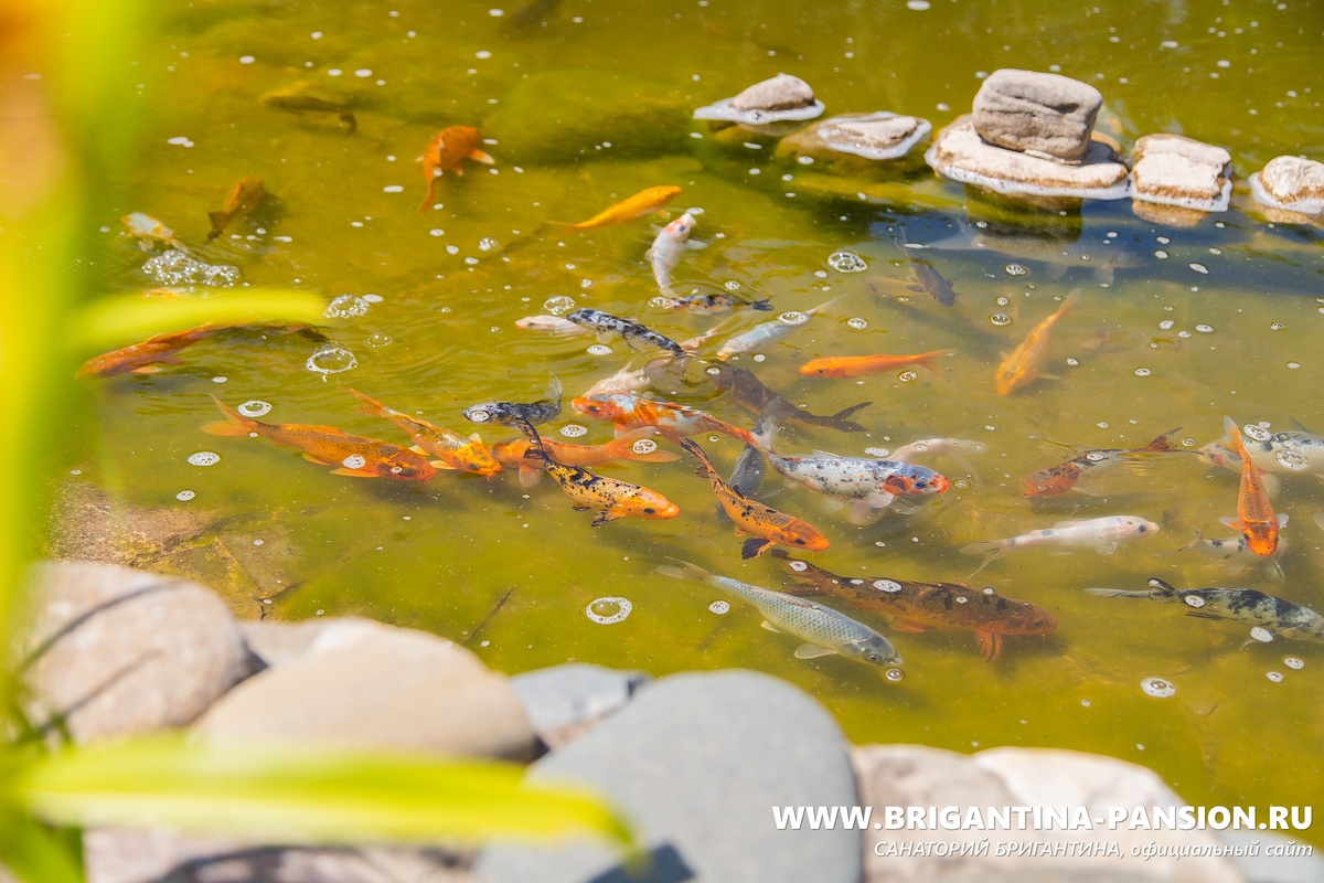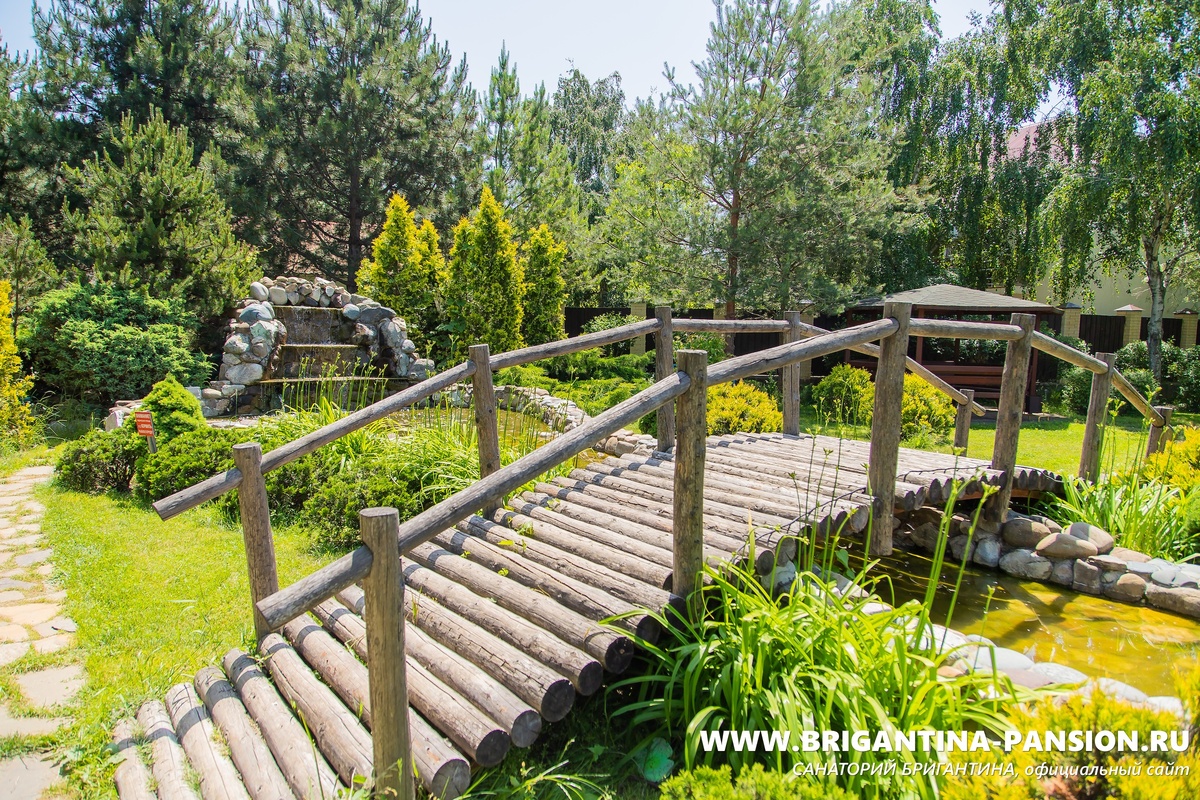 Территория «Бригантины» окружена высоким забором по периметру. За комплексом ведется круглосуточное наблюдение. Местность дополнена зелеными насаждениями, клумбами, беседками, лавочками и даже небольшим прудом с рыбами. На территории санатория находится: