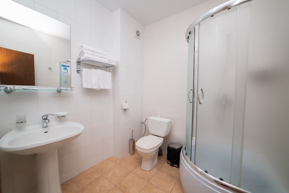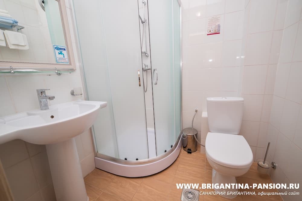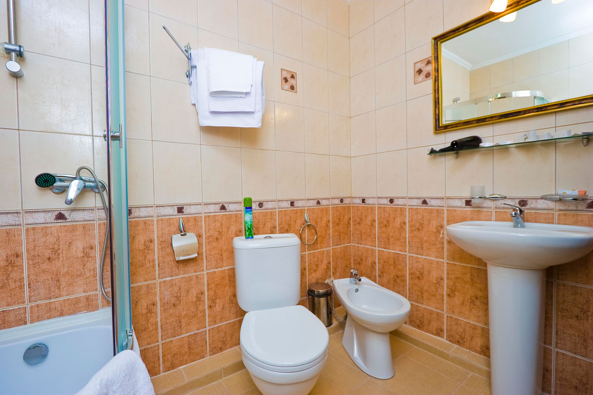 Санузел: Душевая кабина, раковина, унитаз, биде. Укомплектован туалетными принадлежностями и полотенцами.