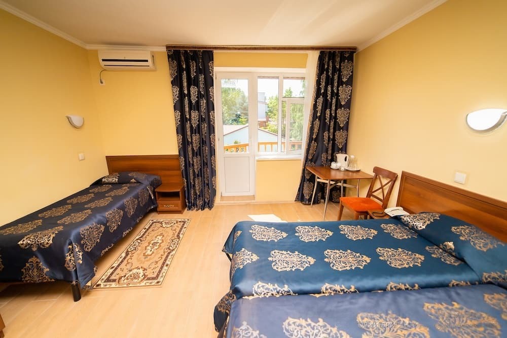 Мебель: Три кровати, прикроватные тумбы, стол, стулья.