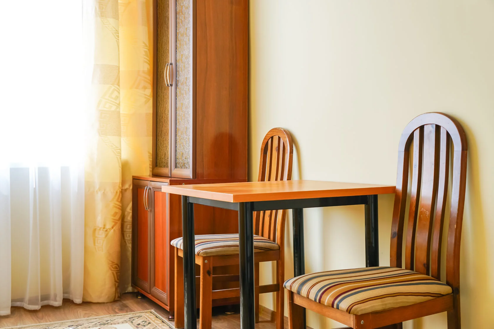 Мебель: Две кровати, прикроватные тумбы, стол, стулья, шкаф, журнальный стол.