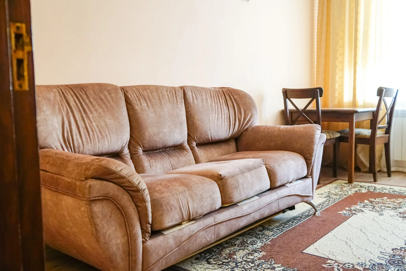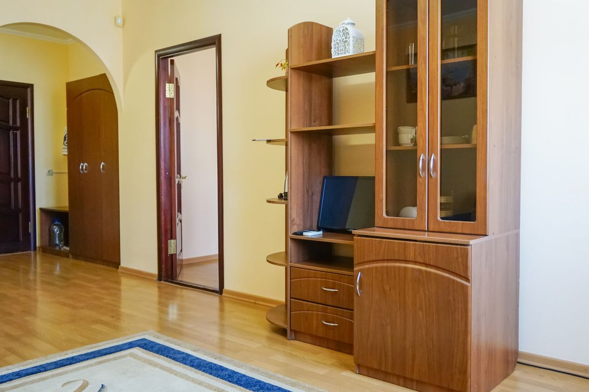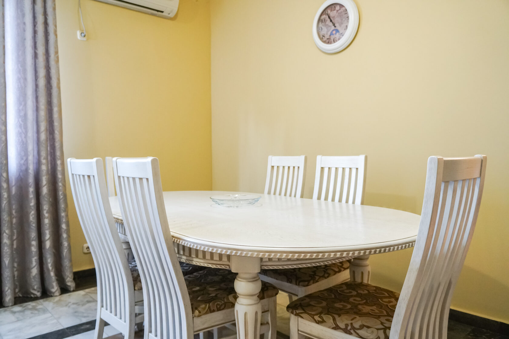 Мебель: Двуспальная кровать, прикроватные тумбы, раскладной диван, стол, стулья, два кресла, кухонная мебель.