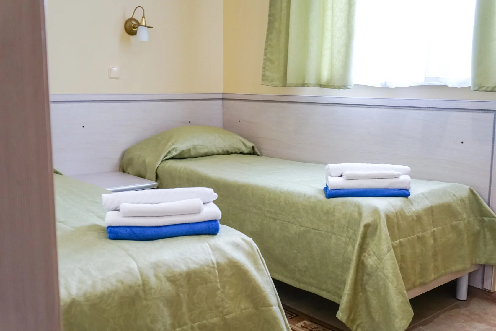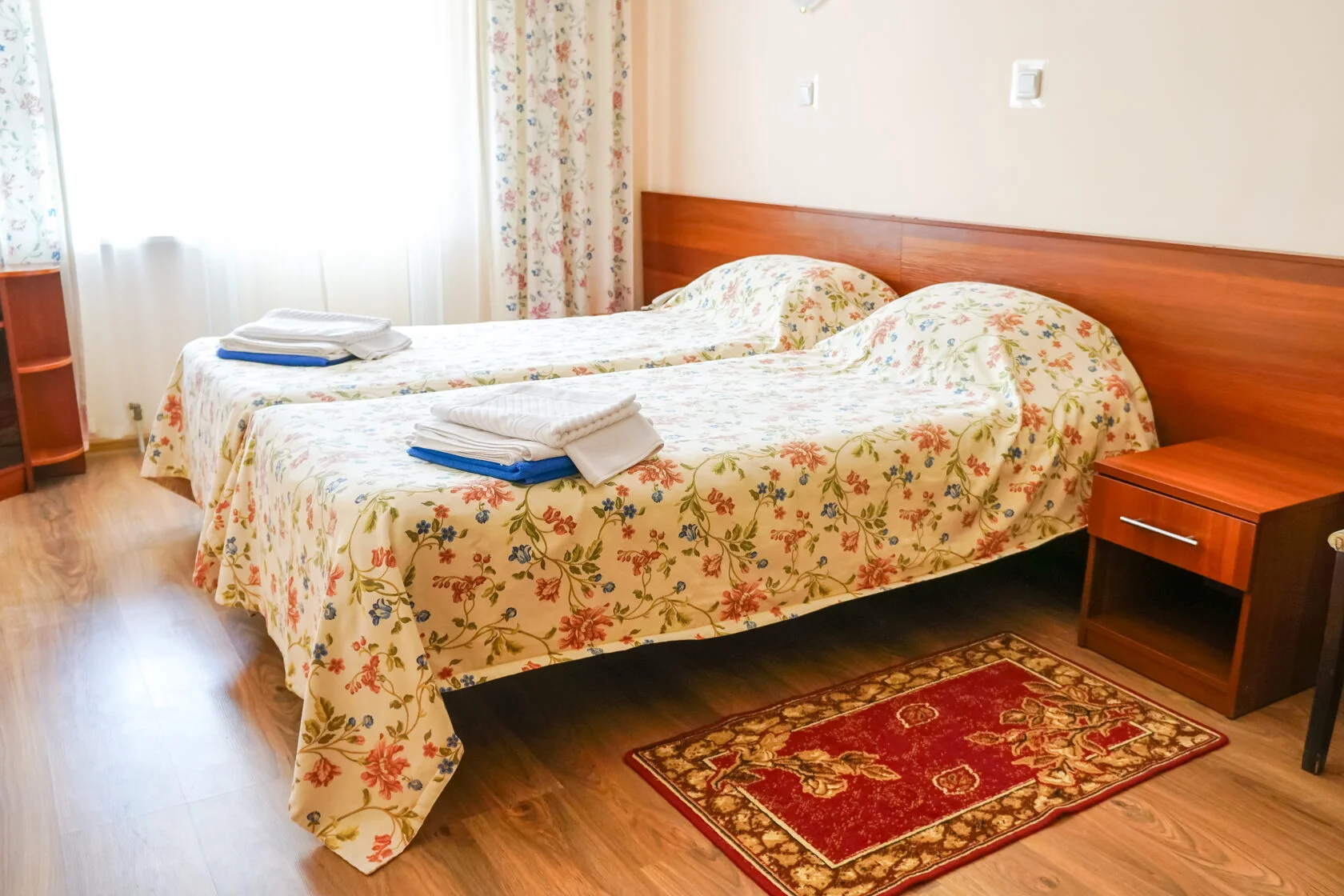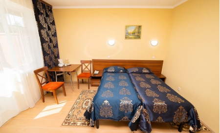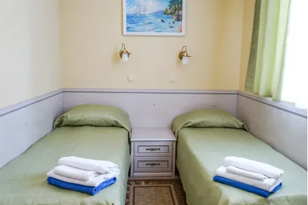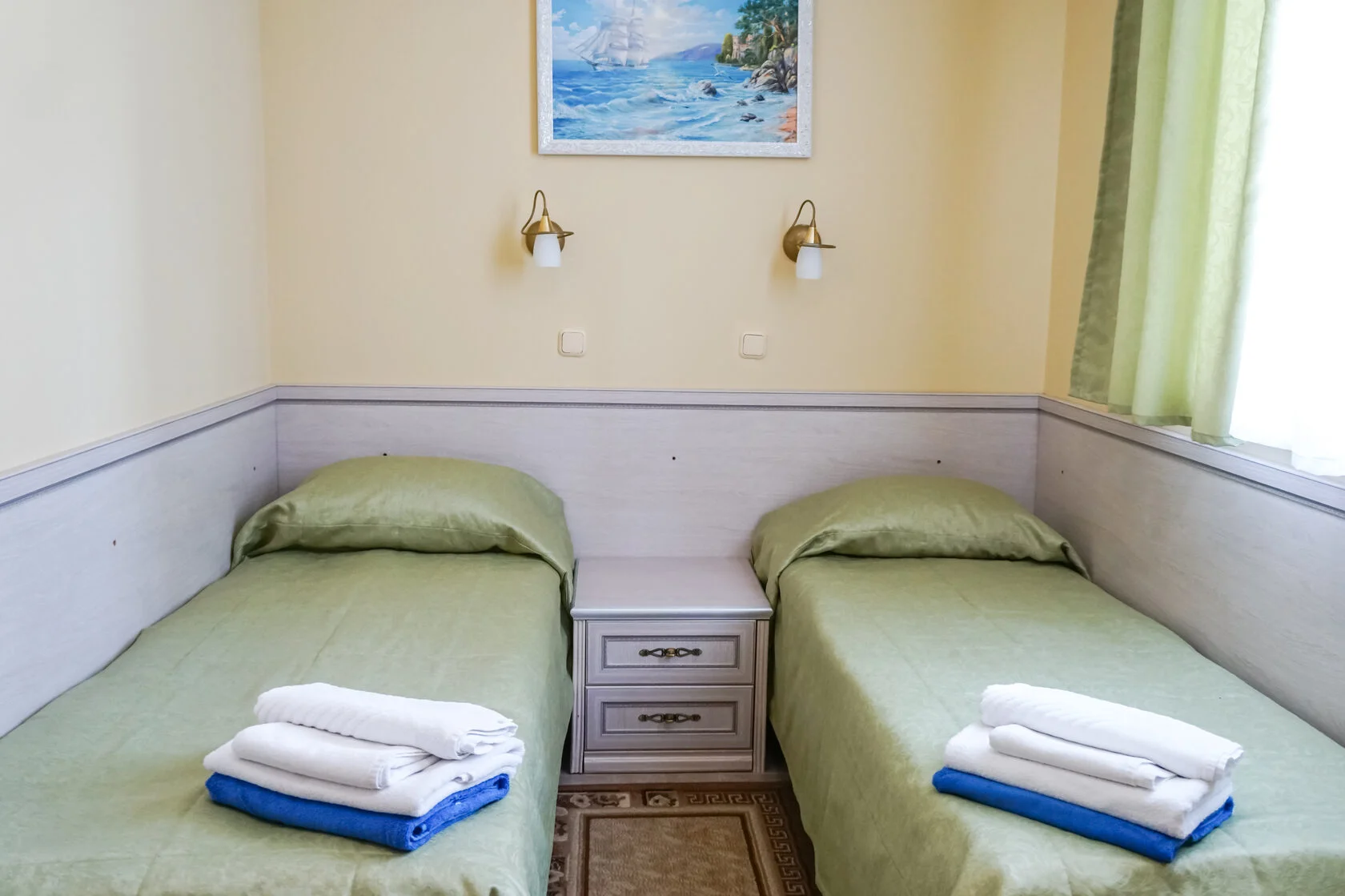 Мебель: Две кровати, прикроватные тумбы, стол, стулья.