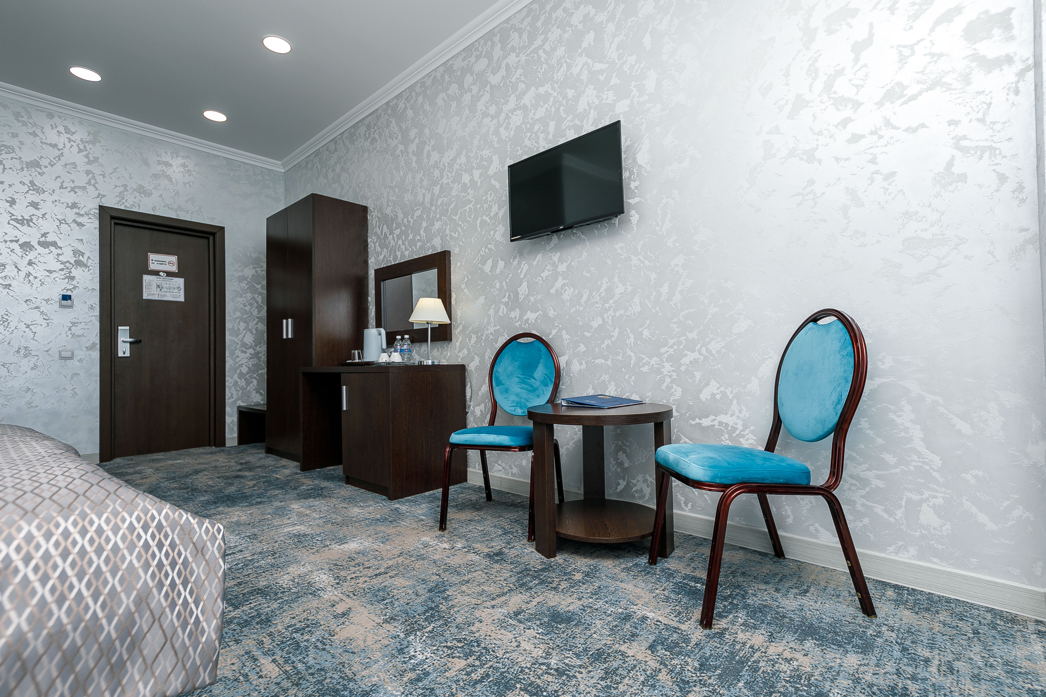 Мебель: вешалка, зеркало, ковровое покрытие, кровати односпальные /одна двуспальная кровать, прикроватные тумбочки, стол, стулья, шкаф.