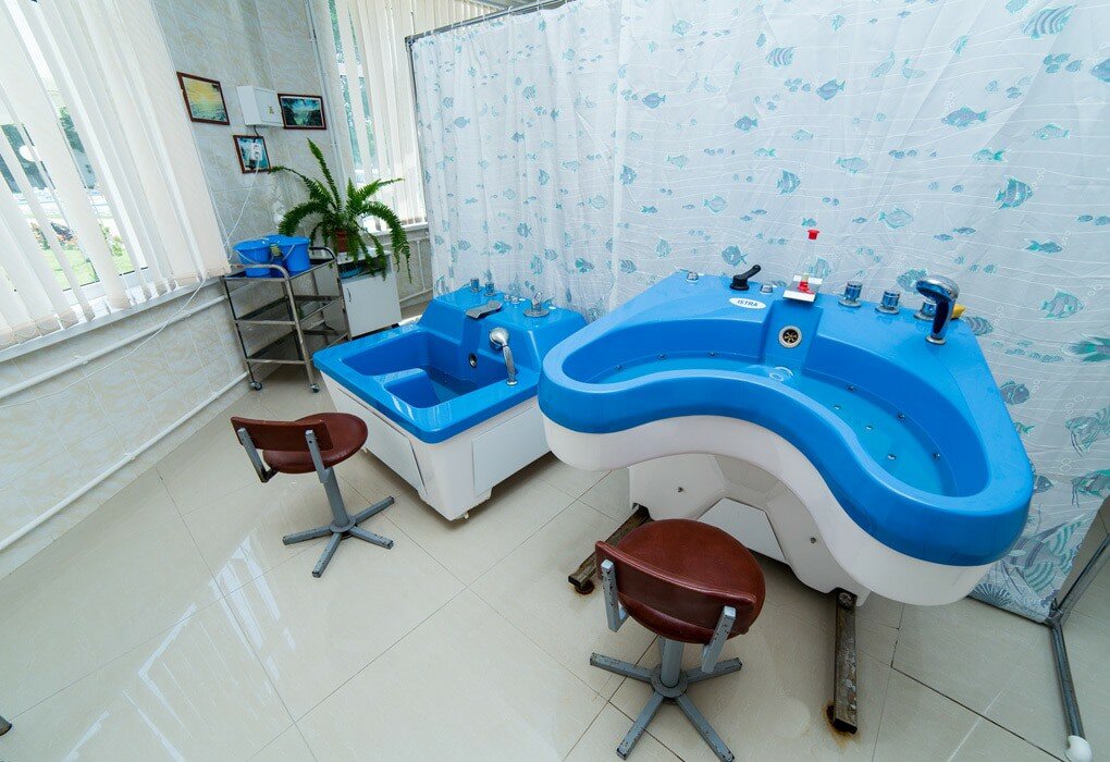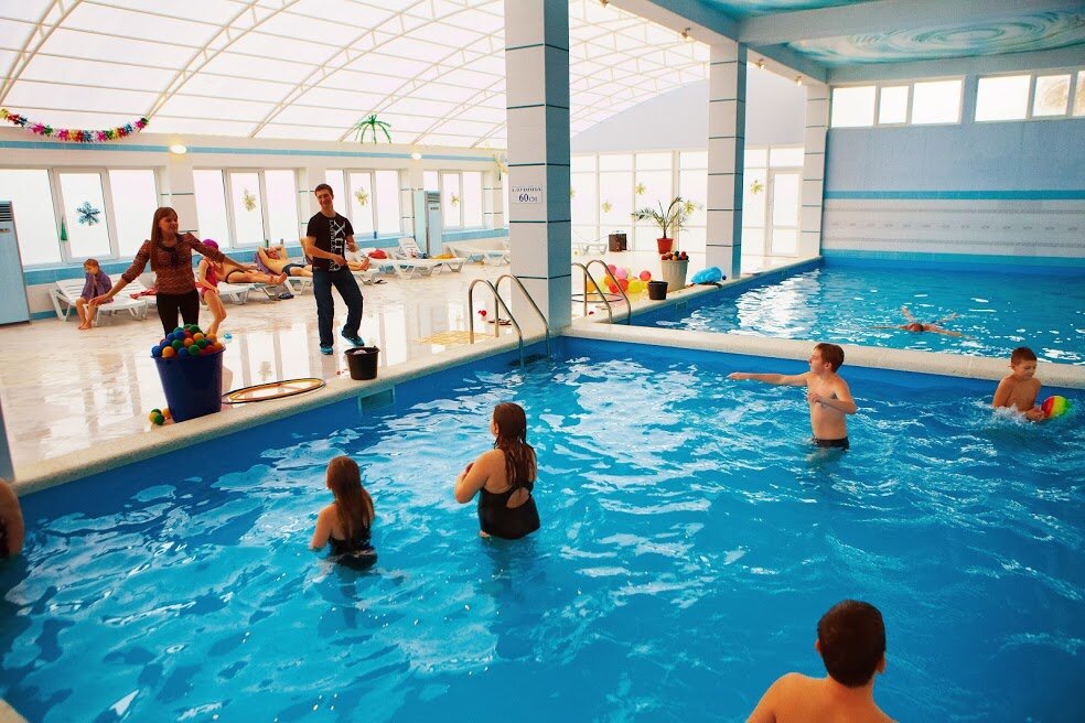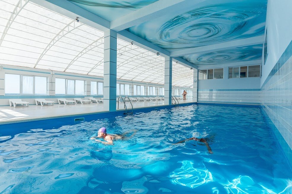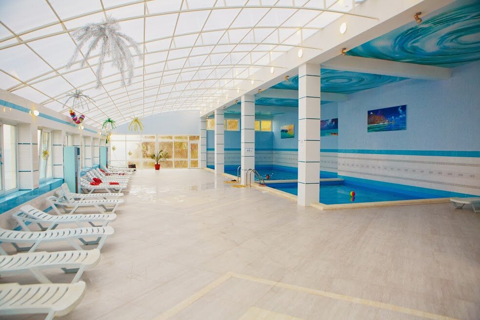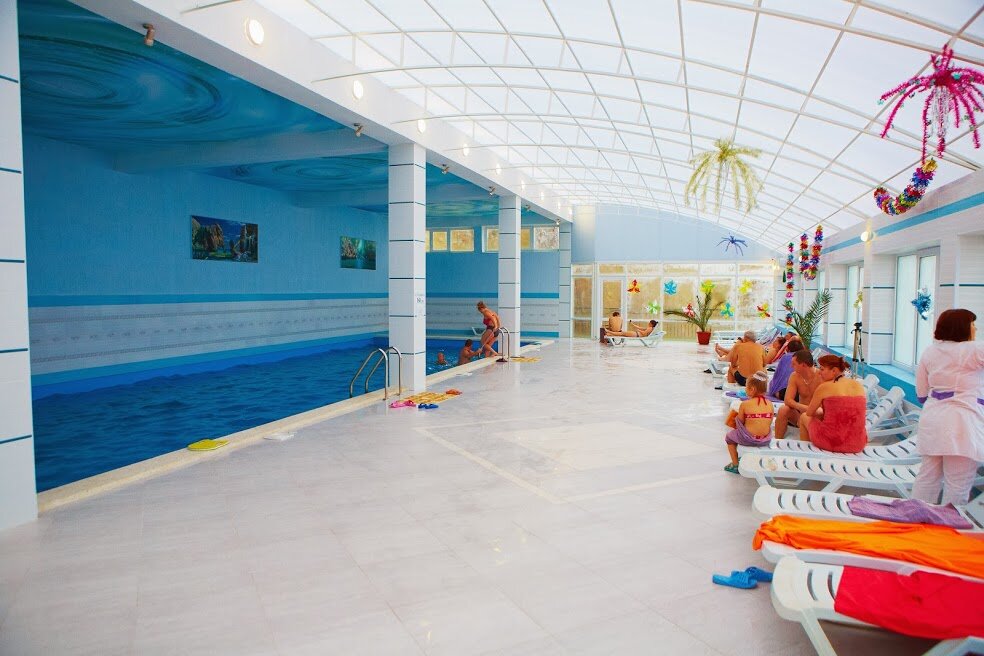 Для гостей санатория функционируют три бассейна с морской водой с зеркалами поверхности 120 кв.м, 65 кв.м, и 40 кв.м, с соответствующими глубинами — 180 см, 150см и 60 см., с взрослым, подростковым и детским отделением, вокруг которого располагается просторная комфортная релакс-зона. Крытый бассейн в 40 кв. м для лечения. Есть уникальный «Зимний пляж» под прозрачным куполом с тремя бассейнами, заполненными морской водой. Три стеклянных стены этого сооружения позволяют загорать зимой. При «Зимнем пляже» работает финская сауна, после которой можно освежиться прямо в море, есть кабинет массажа и практикуются оригинальные SPA-процедуры.