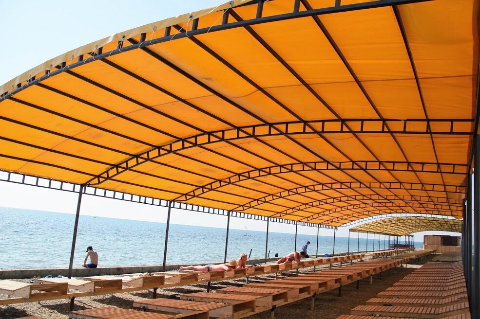 Пляж: Собственный, Галечный, Кабинки для переодевания, Навесы, Туалет, Шезлонги