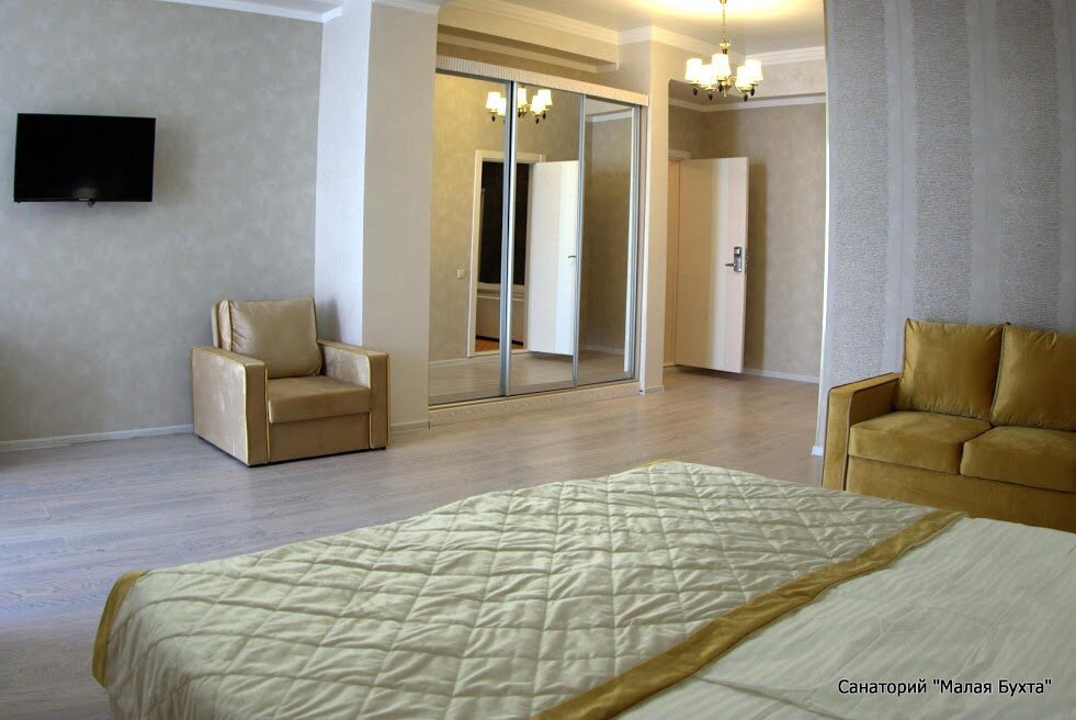 Санаторий «Малая бухта» – это комплекс трех- и четырехэтажных корпусов, которые принимают отдыхающих в течение всего года. Корпуса №1 и №2 имеют номера «люкс», а корпус №3 предназначен для семейных гостей. Жилой фонд санатория способен одновременно разместить до 900 человек.
