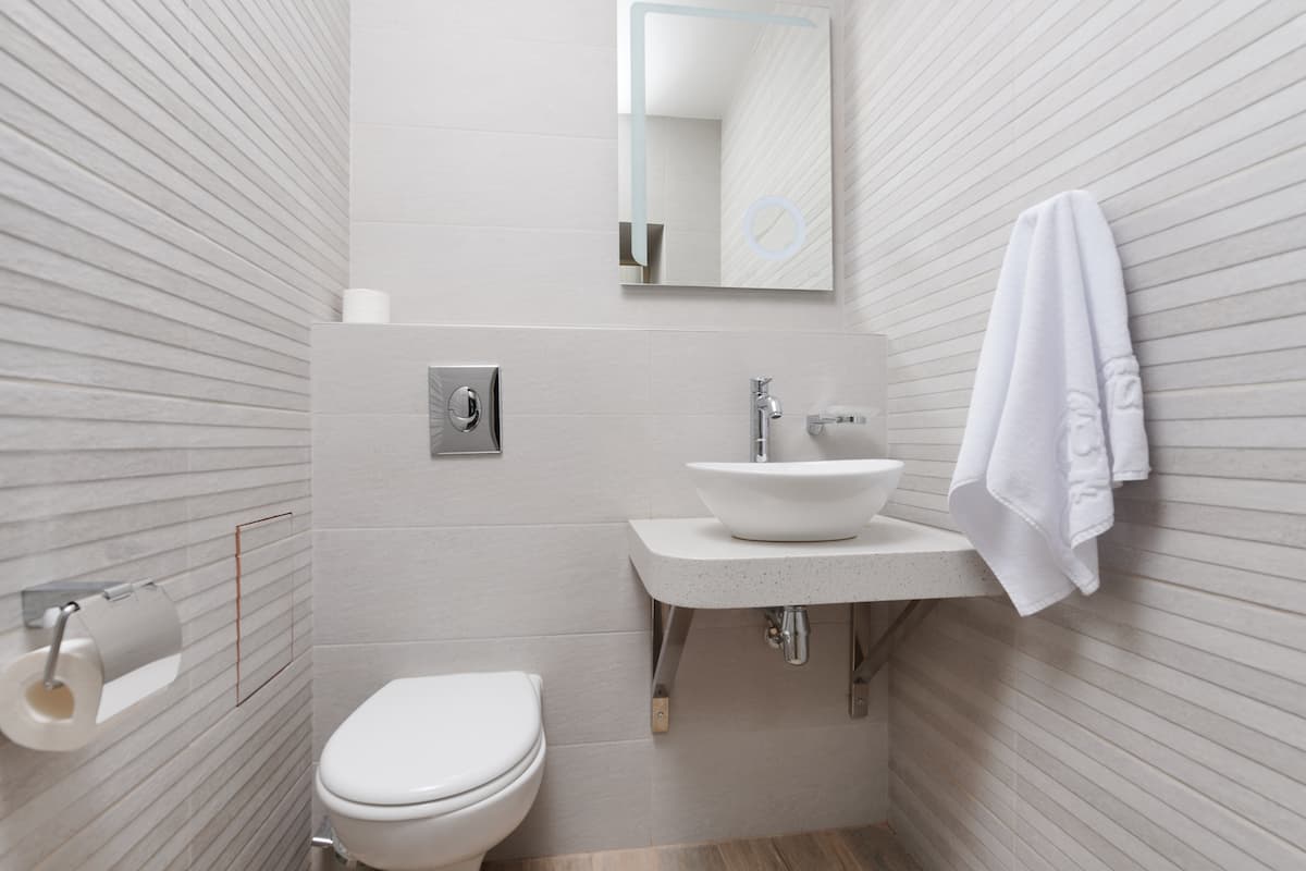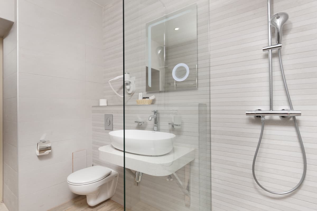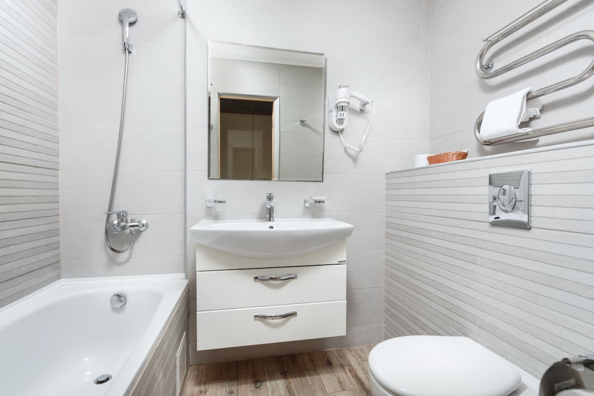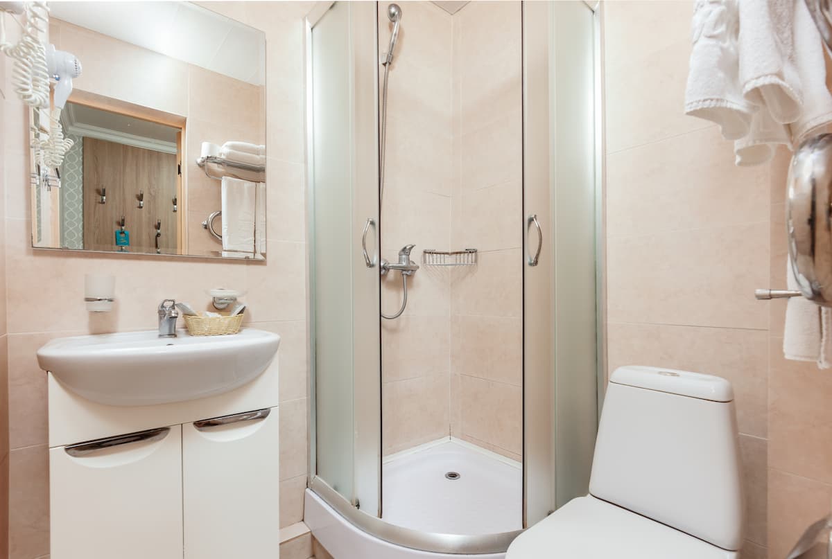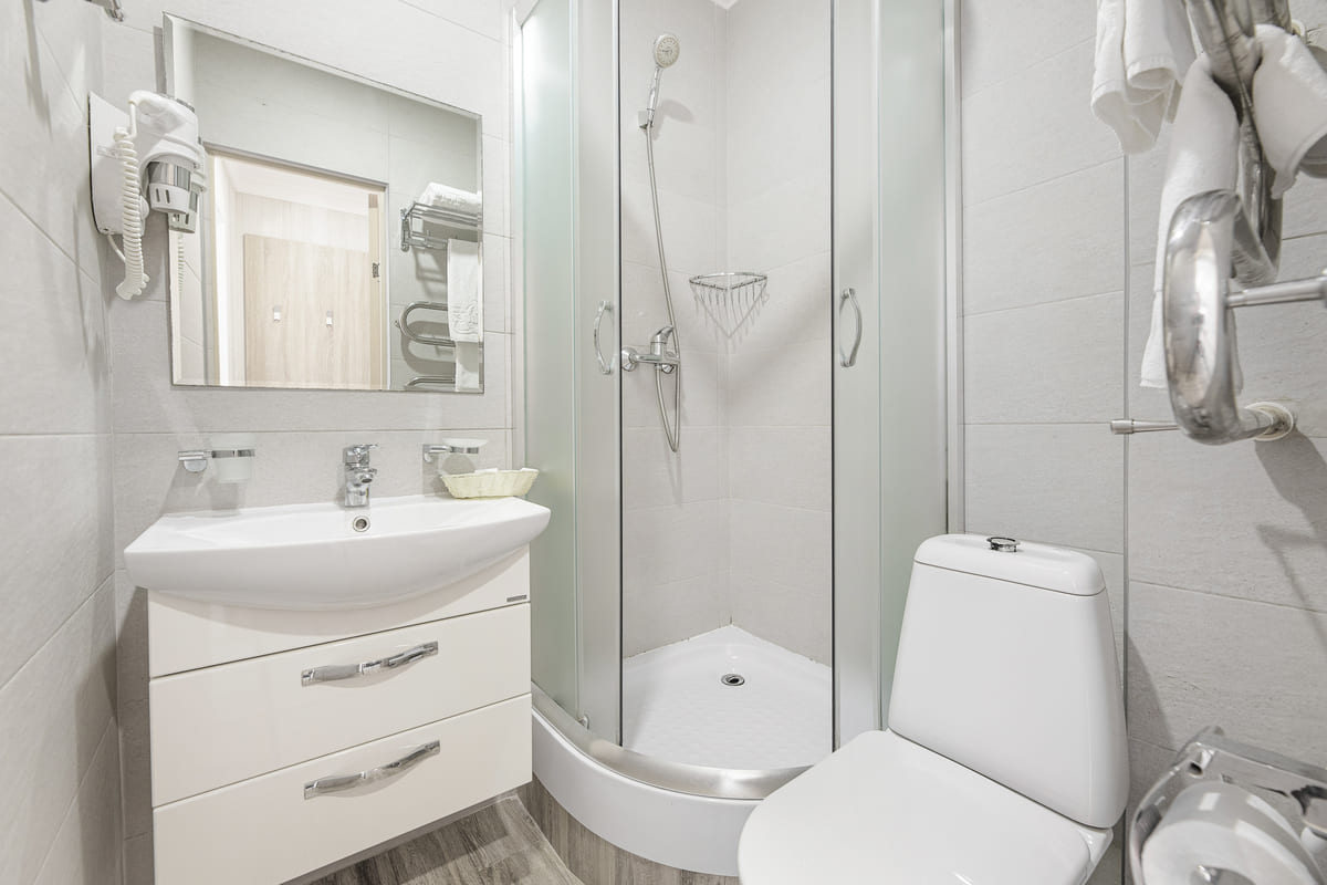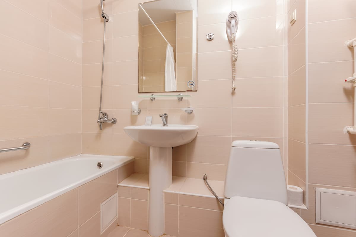 Санузел: с ванной или душевой кабиной, тапочки, туалетные принадлежности, фен.