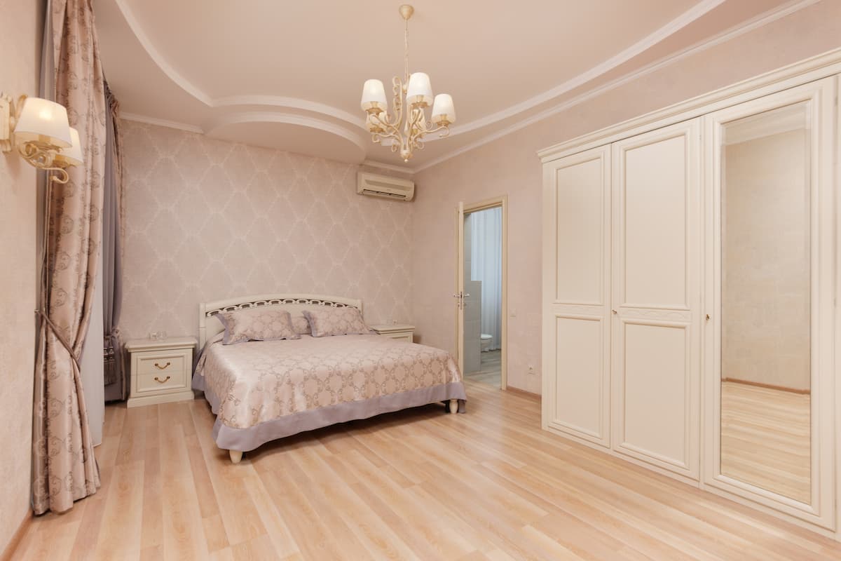 Мебель: вешалка, диван, зеркало, кровати односпальные /одна двуспальная кровать, прикроватные тумбочки, стол, стулья, шкаф.