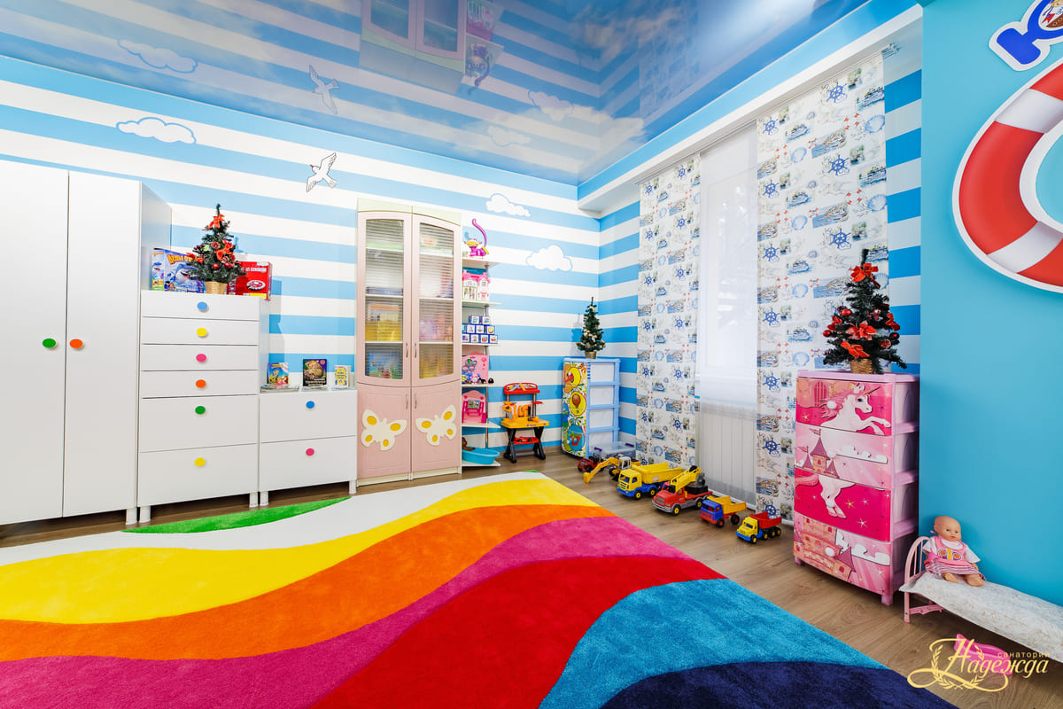 Мебель: вешалка, диван, зеркало, кресло-кровать, кровати односпальные, прикроватные тумбочки, стол, стулья, шкаф.