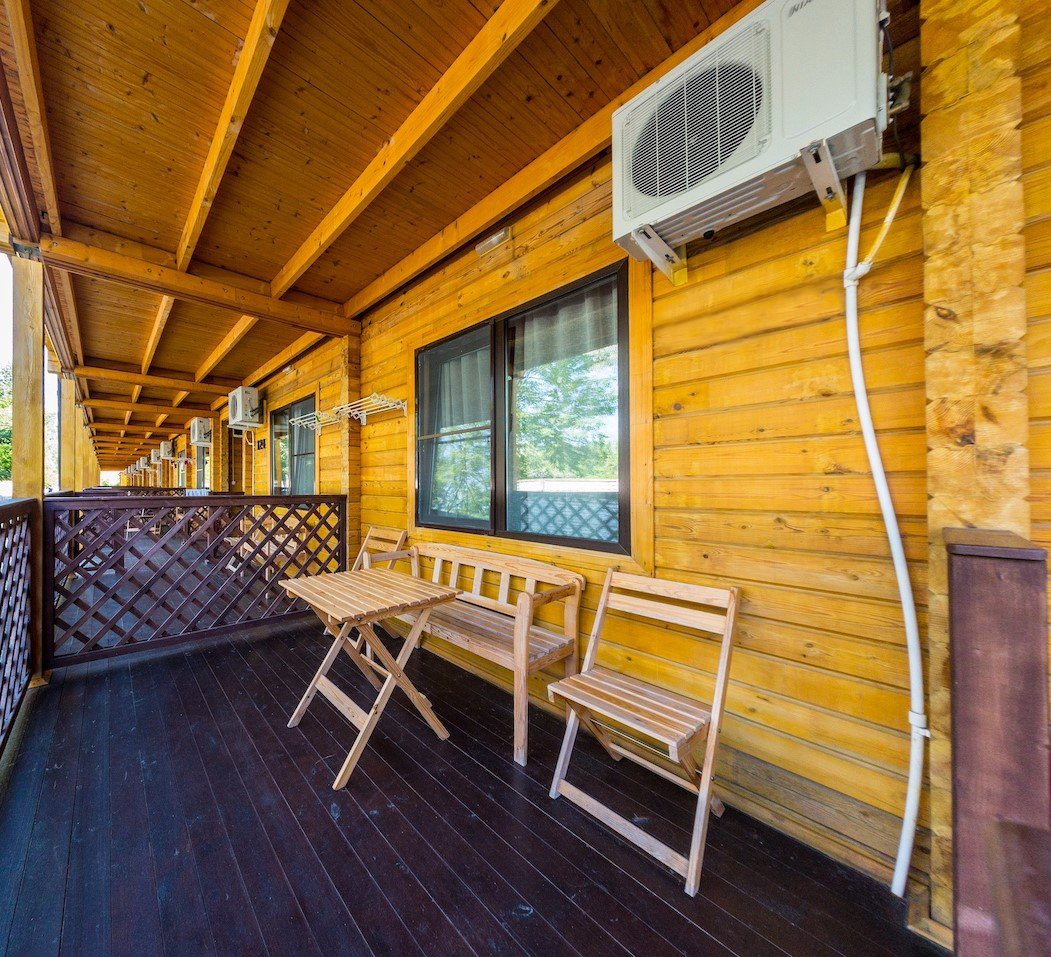 В двух деревянных корпусах отопление от кондиционеров и очень плохая звукоизоляция.