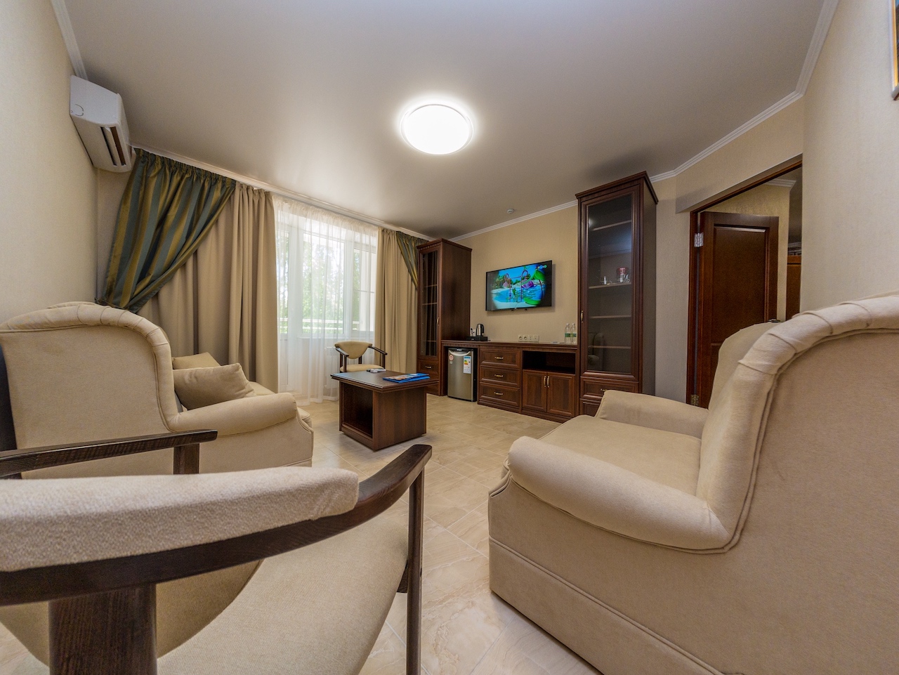 Всего в санатории одновременно может проживать около 1000 гостей. Во всех жилых помещениях проведен современный ремонт. Они хорошо меблированы, оборудованы кондиционером, телевизором и холодильником, имеют отдельный санузел и душ. Каждый номер дополнен своим косметическим набором. Есть двухместные и четырехместные варианты.