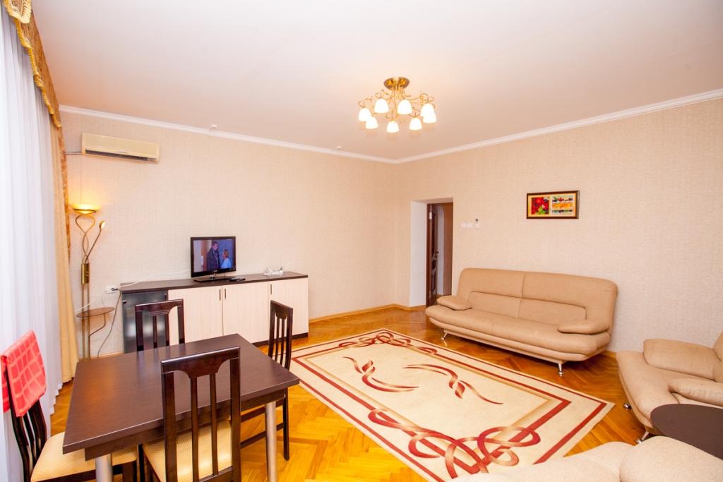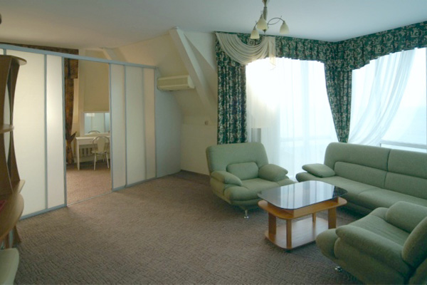 Мебель: Две кровати, диван-кровать, шкаф, тумбочки, отдельный обеденный зал, 2 кресла, стол, стулья.