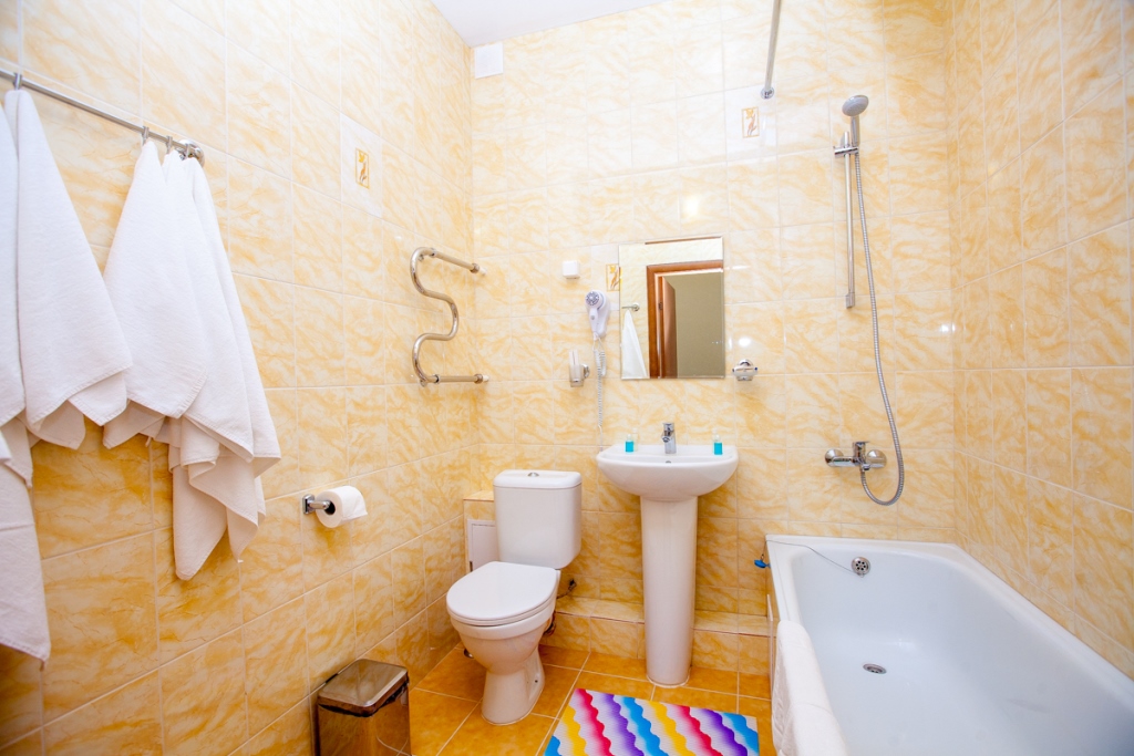 Санузел: Ванная комната, фен, средства личной гигиены.