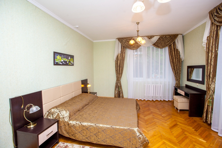 Мебель: Две кровати, диван, платяной шкаф, 2 тумбочки, туалетный столик, журнальный столик, 2 стула.
