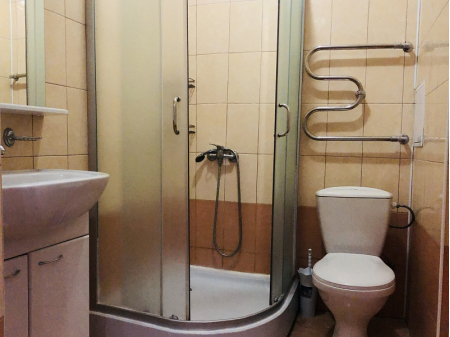 Санузел: с душевой кабиной, тапочки, туалетные принадлежности, фен, халат.