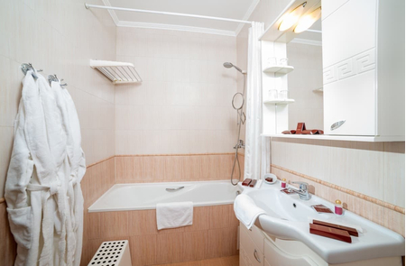 Санузел: Душевая кабина, фен, туалетно-косметические принадлежности, халаты, тапочки, пляжные полотенца.