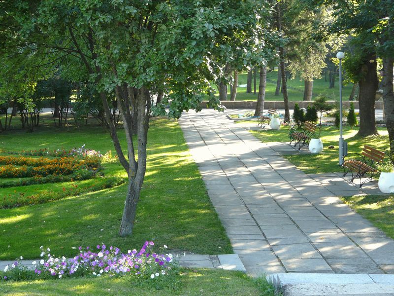Напротив санатория большой парк Победы, благоустроен. До центра курортной зоны и ж.д. вокзала 15-20 минут ходьбы.