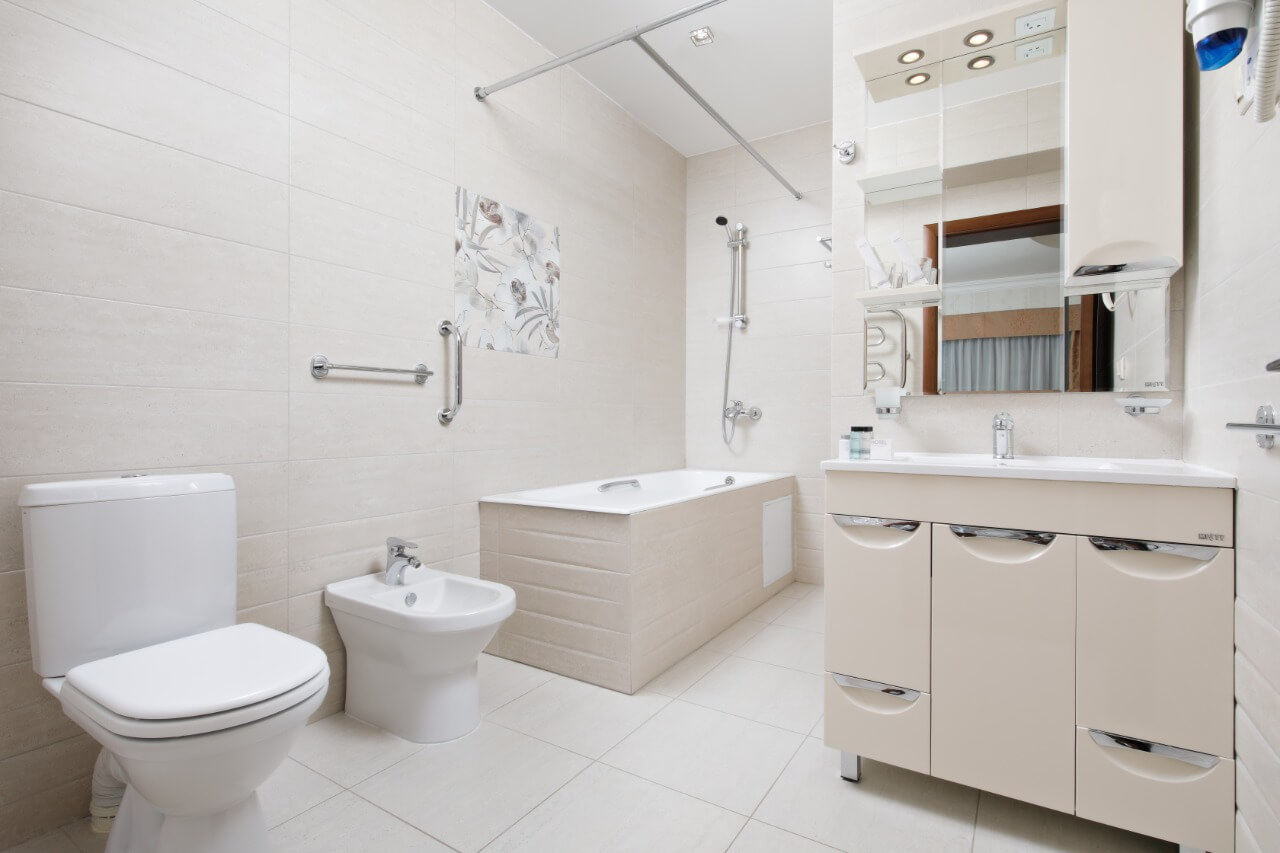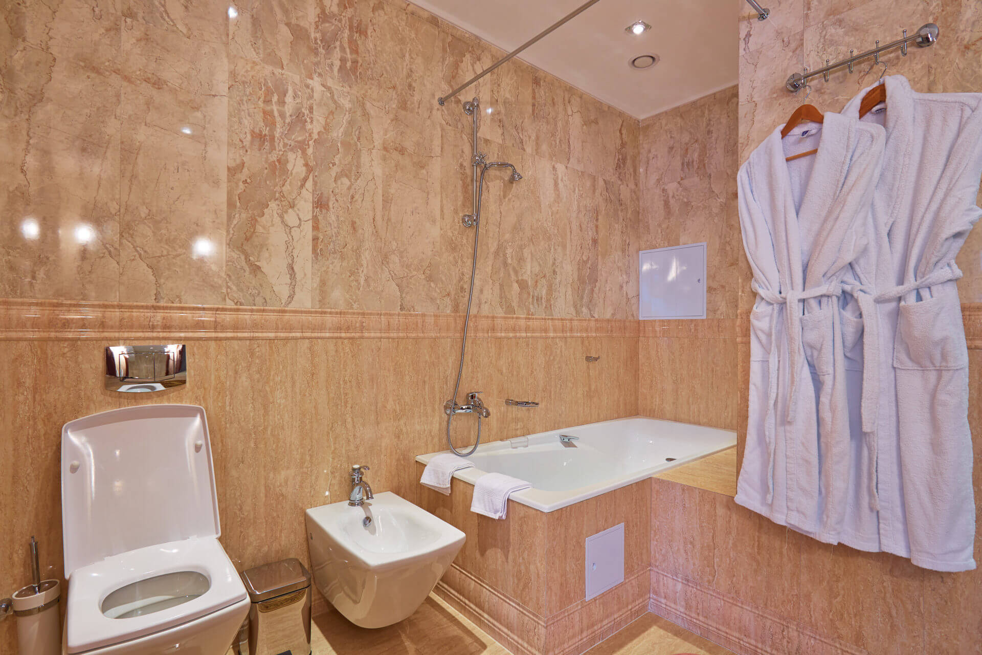 Санузел: биде, с ванной, тапочки, туалетные принадлежности, фен, халат.