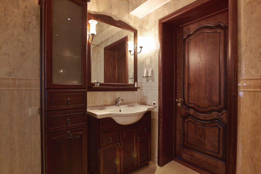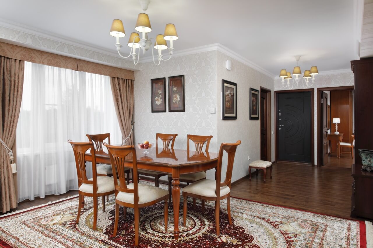 Мебель: вешалка, зеркало, кровать двуспальная, прикроватные тумбочки, стол, стулья, шкаф.