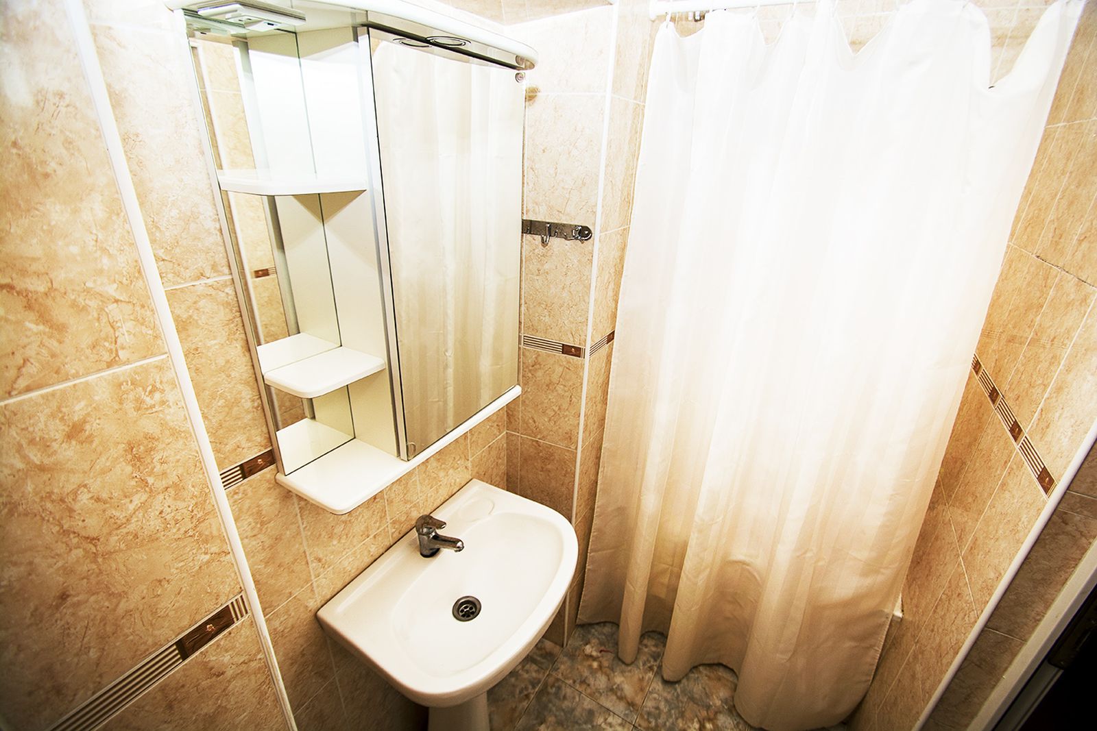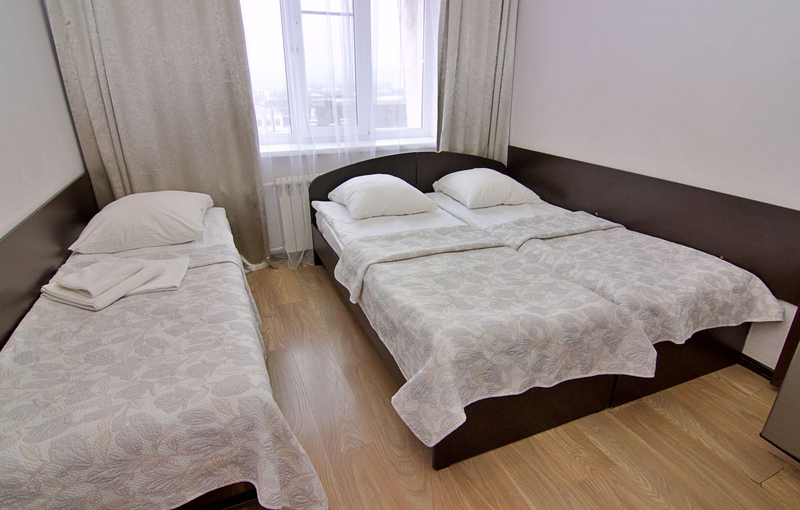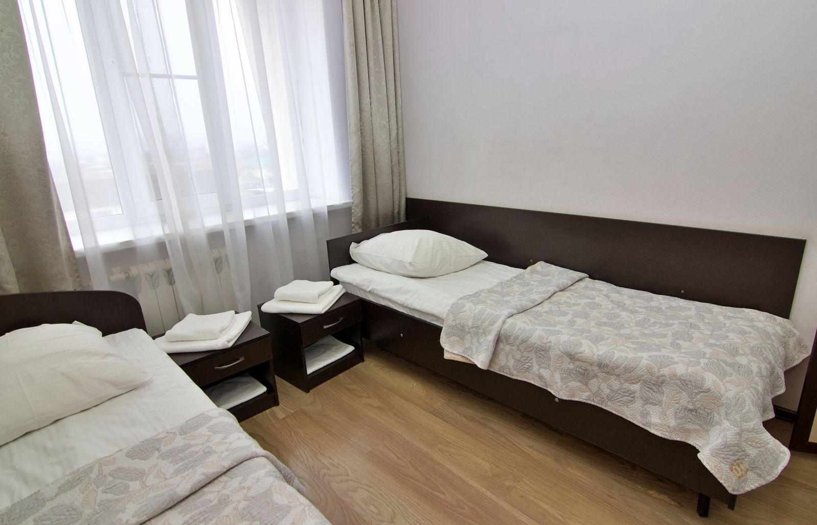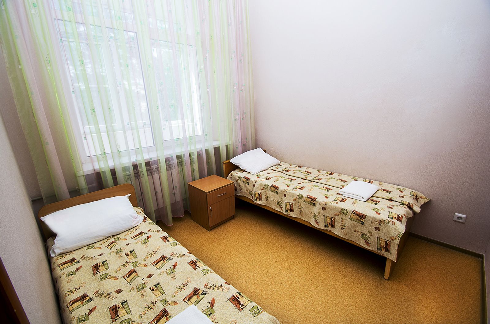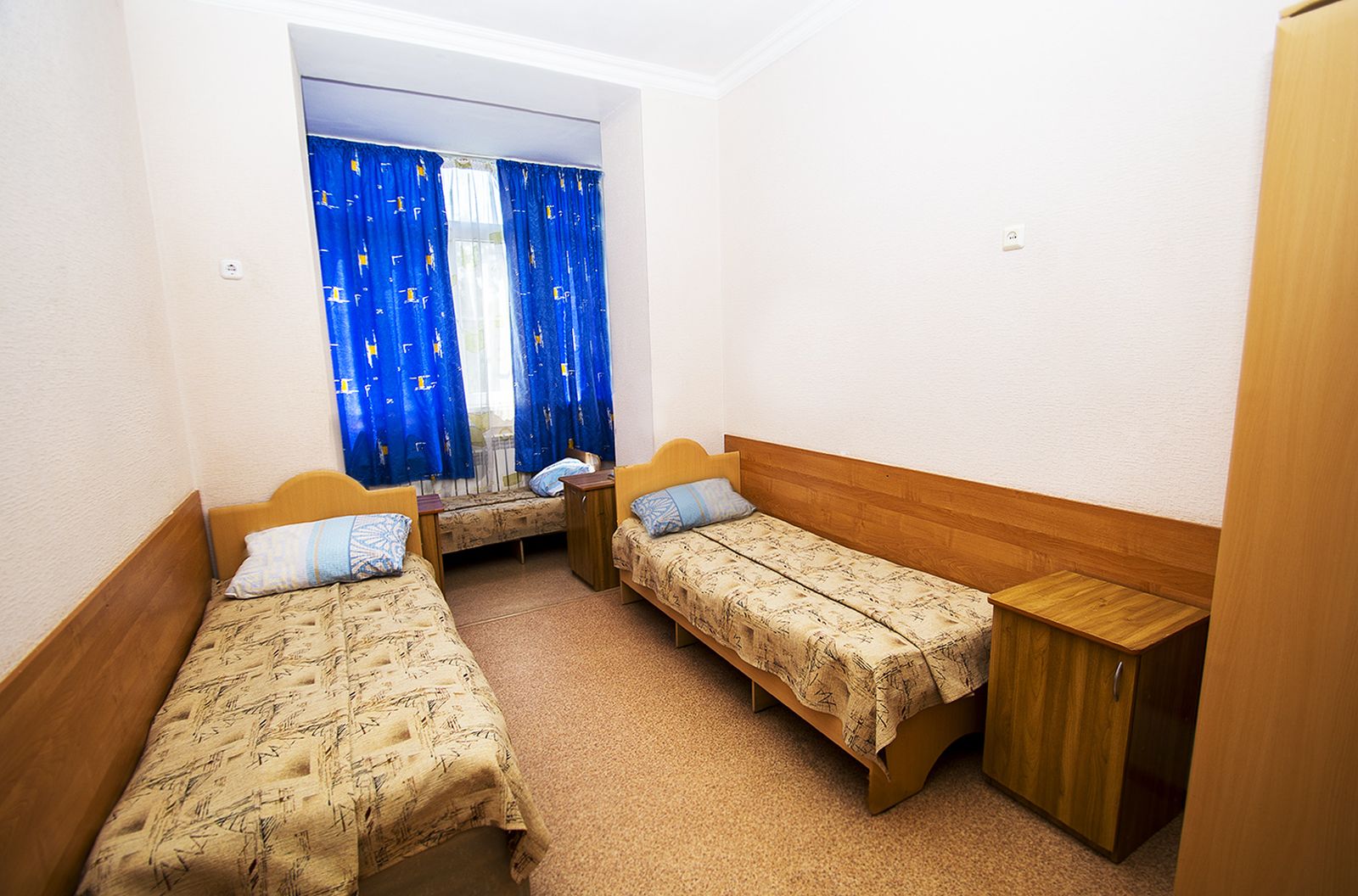 Двухместный стандарт — два односпальных места, прикроватные тумбы, шкаф, холодильник, телевизор, электрочайник, телефон, набор посуды. Ванная или душевая кабина.