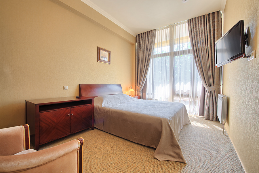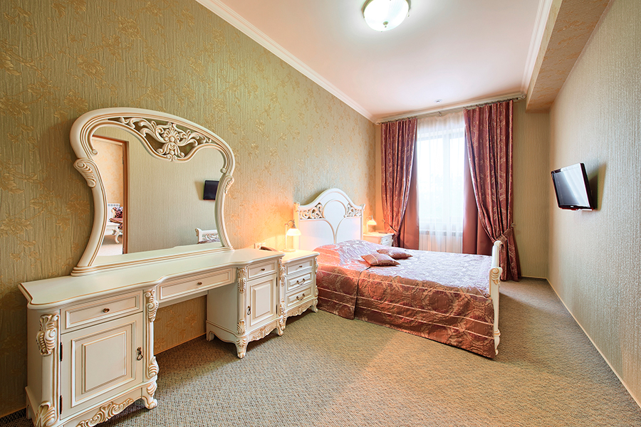 Мебель: Удобная кровать (двуспальная или 2 односпальных), прикроватные тумбы со светильниками, рабочая зона с секретером, журнальный столик, кресло.