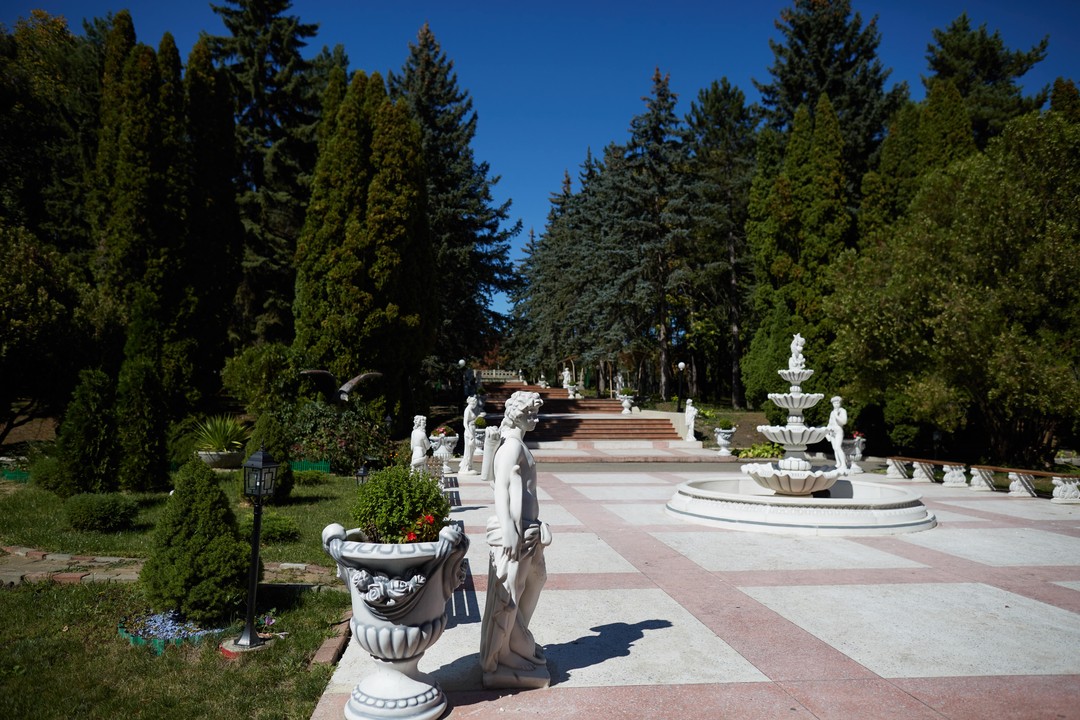 • Собственная территория: просторный закрытый участок с прогулочными дорожками, зонами отдыха, фонтанами и статуями