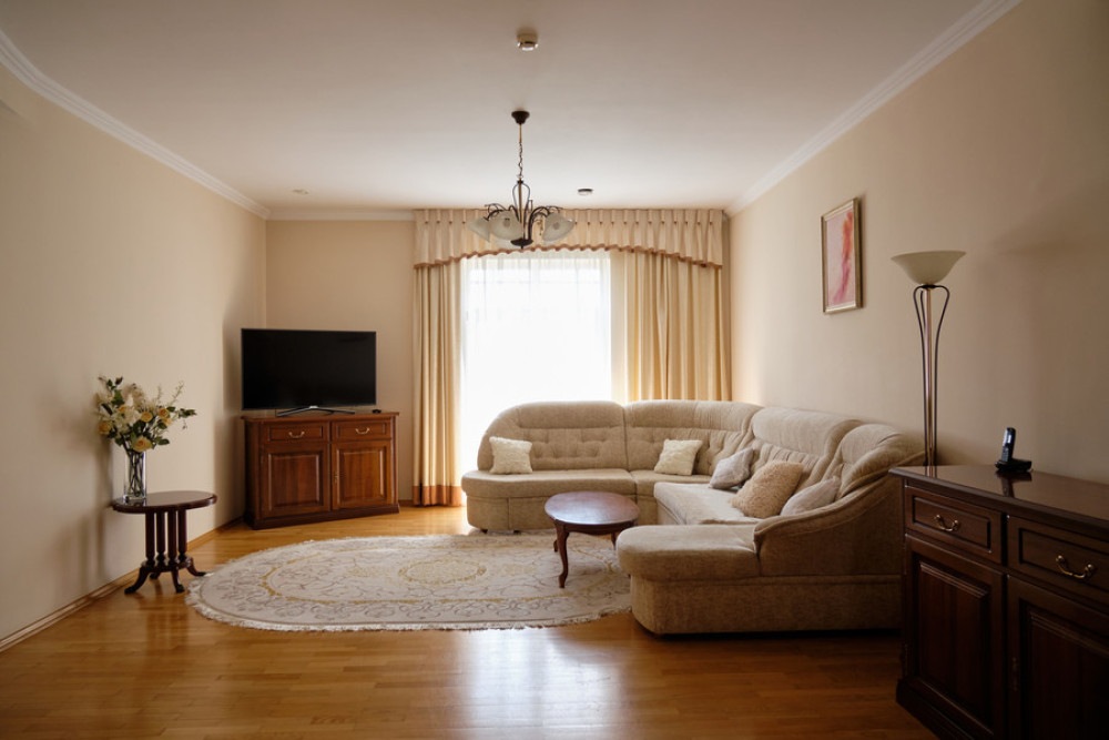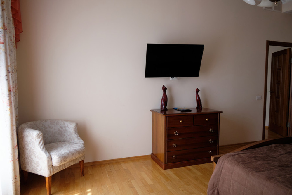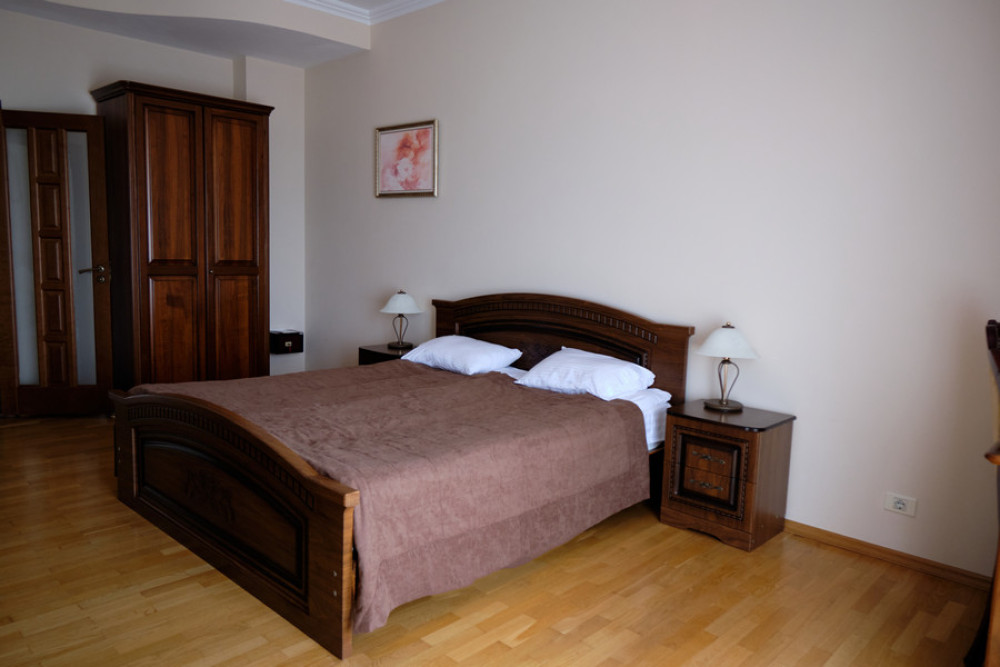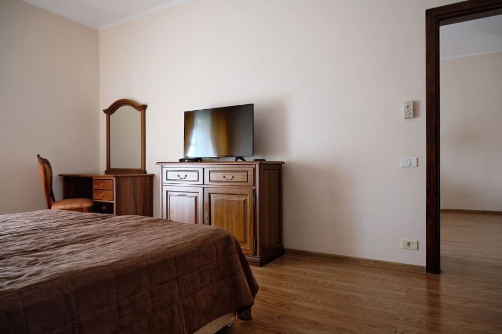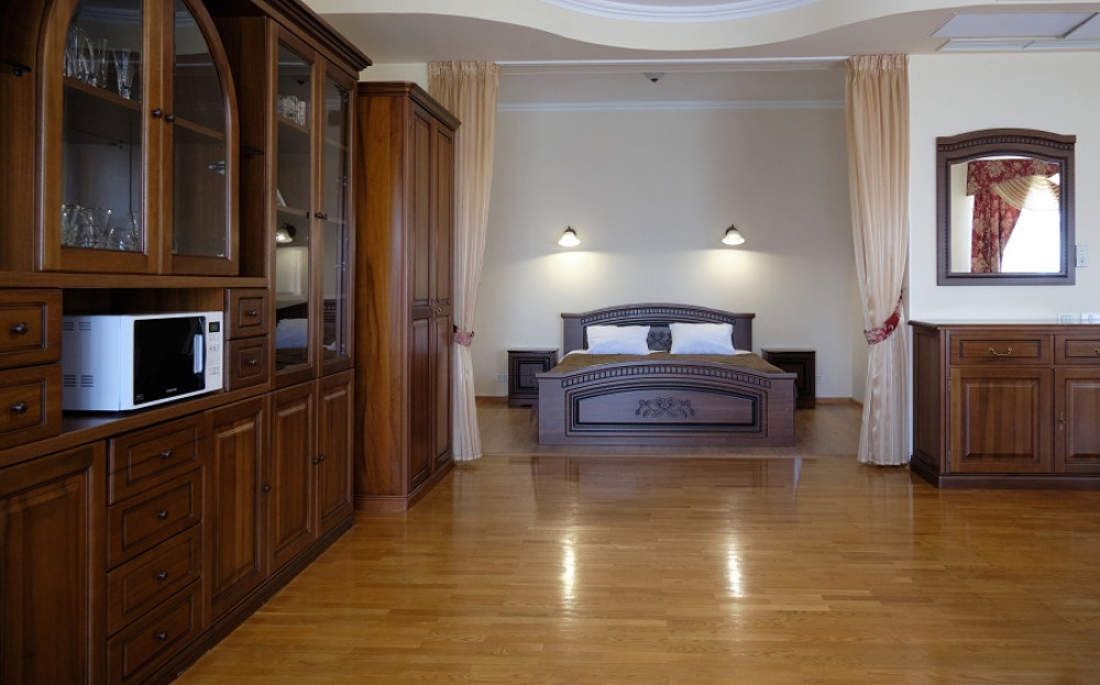 Мебель: мини-кухня, диван, зеркало, кресла, кровать двуспальная/ две полутороспальные кровати, прикроватные тумбочки, столик туалетный, тумба под телевизор, шкаф.