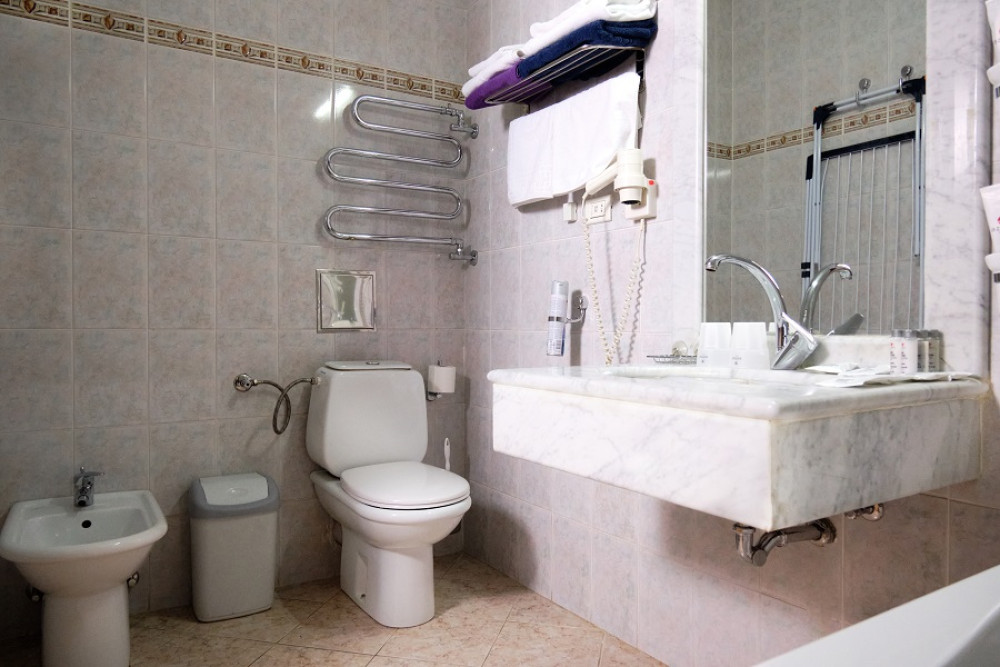 Санузел: биде, с ванной, тапочки, туалетные принадлежности, фен, халат.