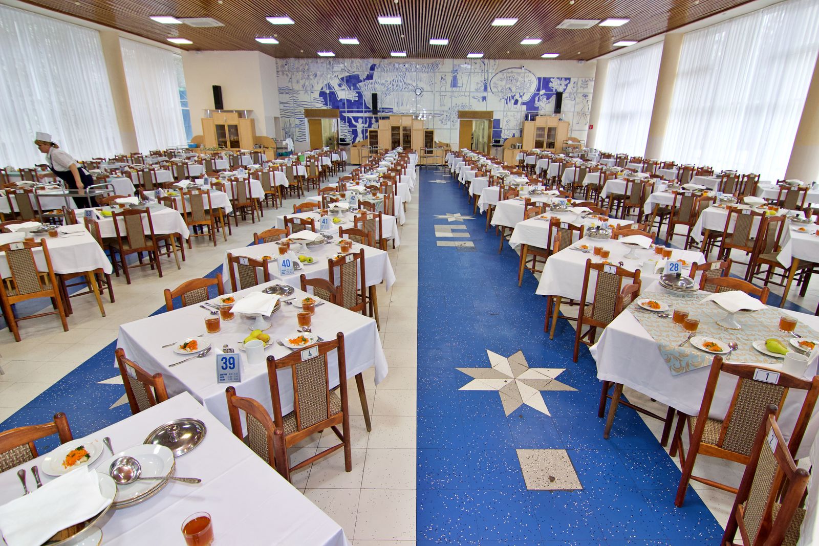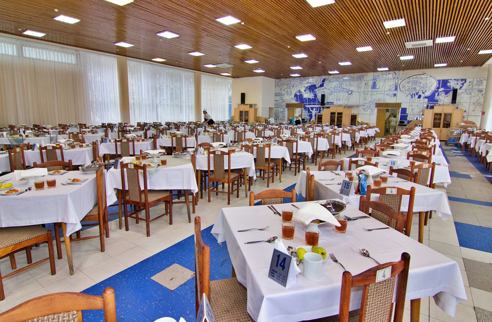 Питался в малом зале. Проблем никаких не было. Еда довольно вкусная, не знаю, как некоторые не надеются. Шведского стола нет, блюда развозят официантки, можно выбрать, что нравится. Питание лечебное по Певзнеру. Назначает диету врач.