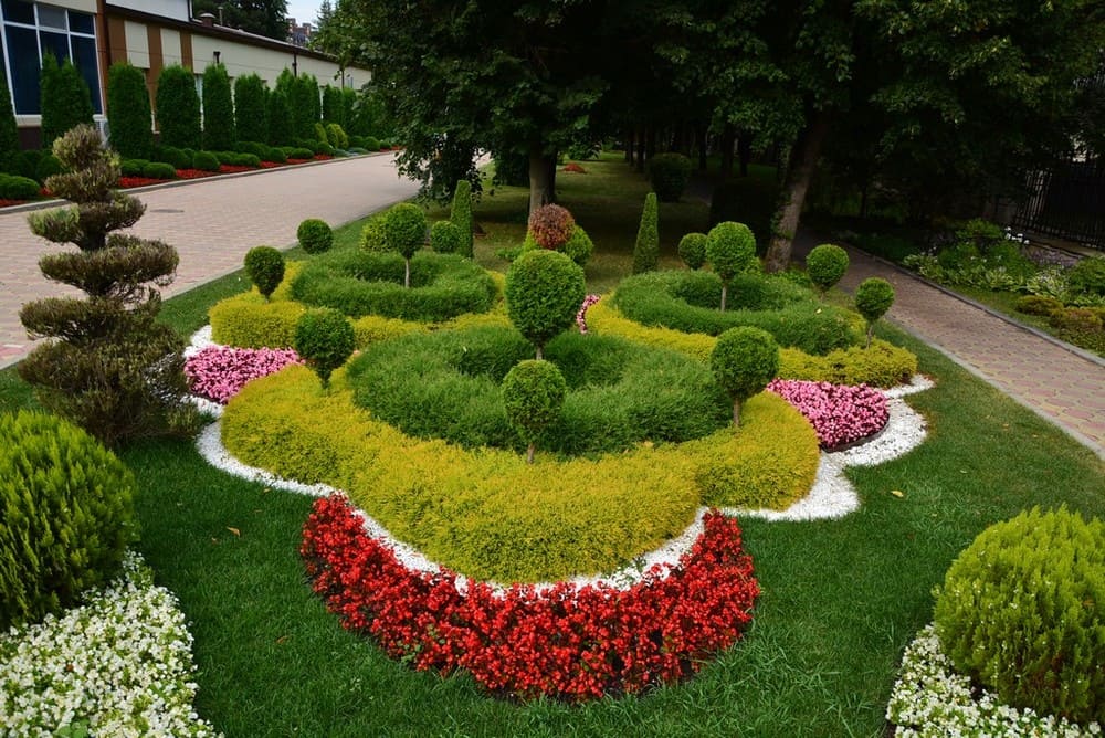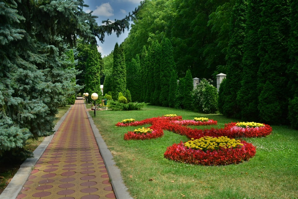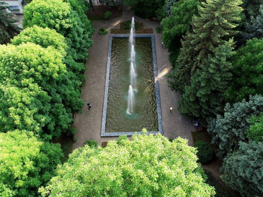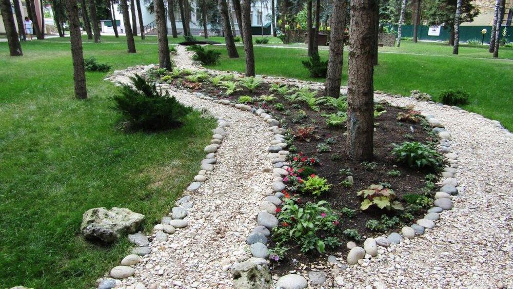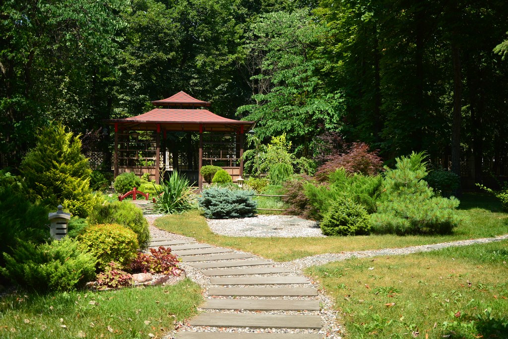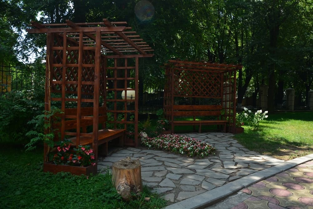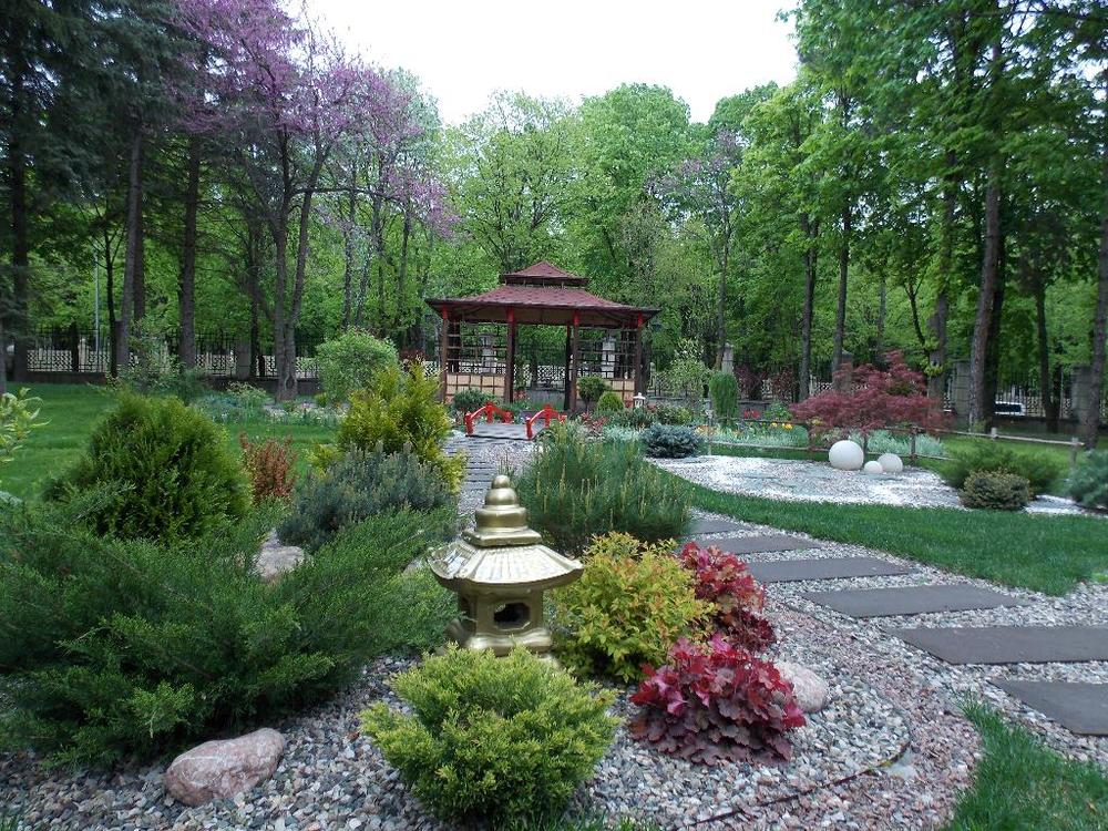 Территория: одна из самых красивых в городе — тематические зоны (лесная, азиатская, детская), фонтаны, ротонды, альпийские горки, зелёные лужайки с шезлонгами